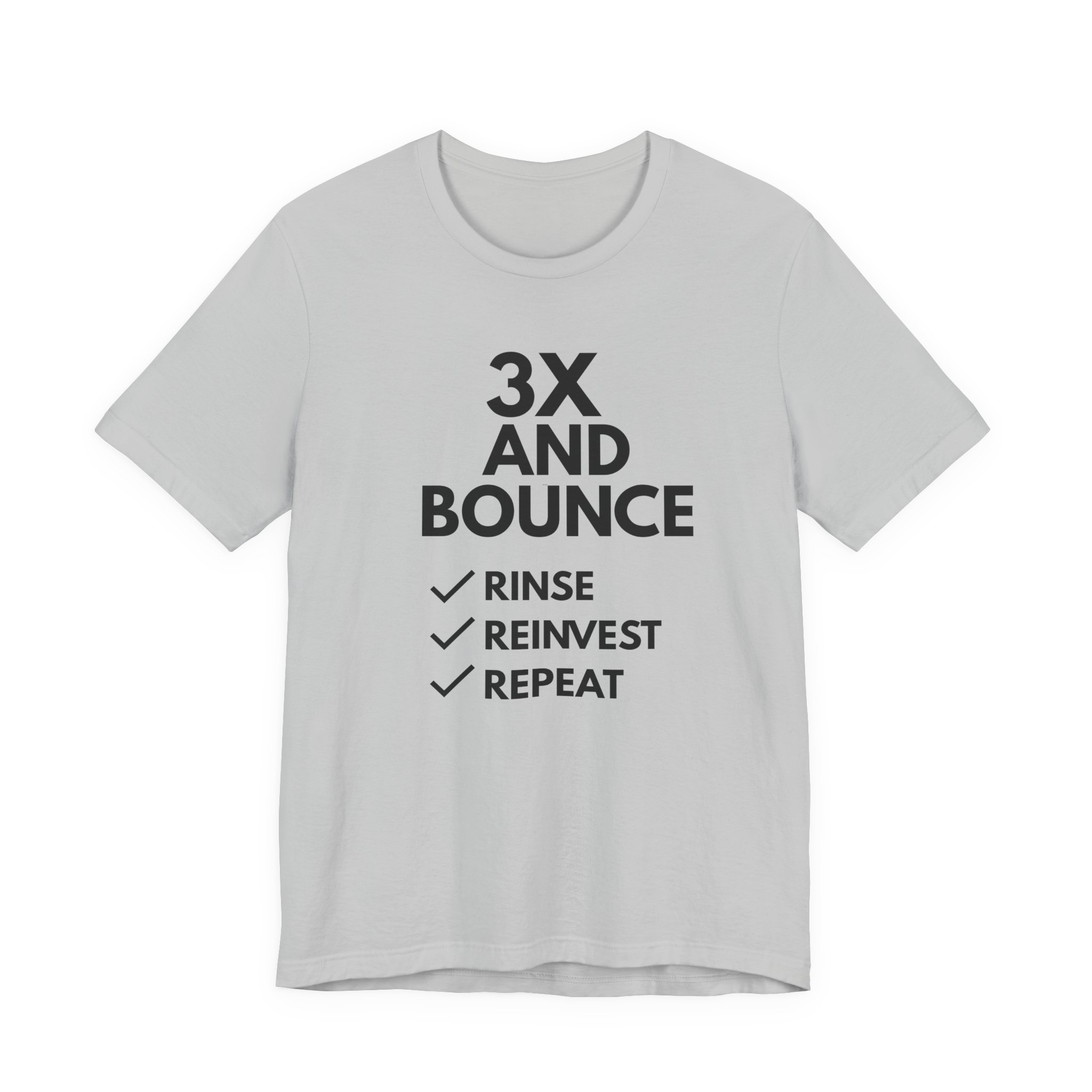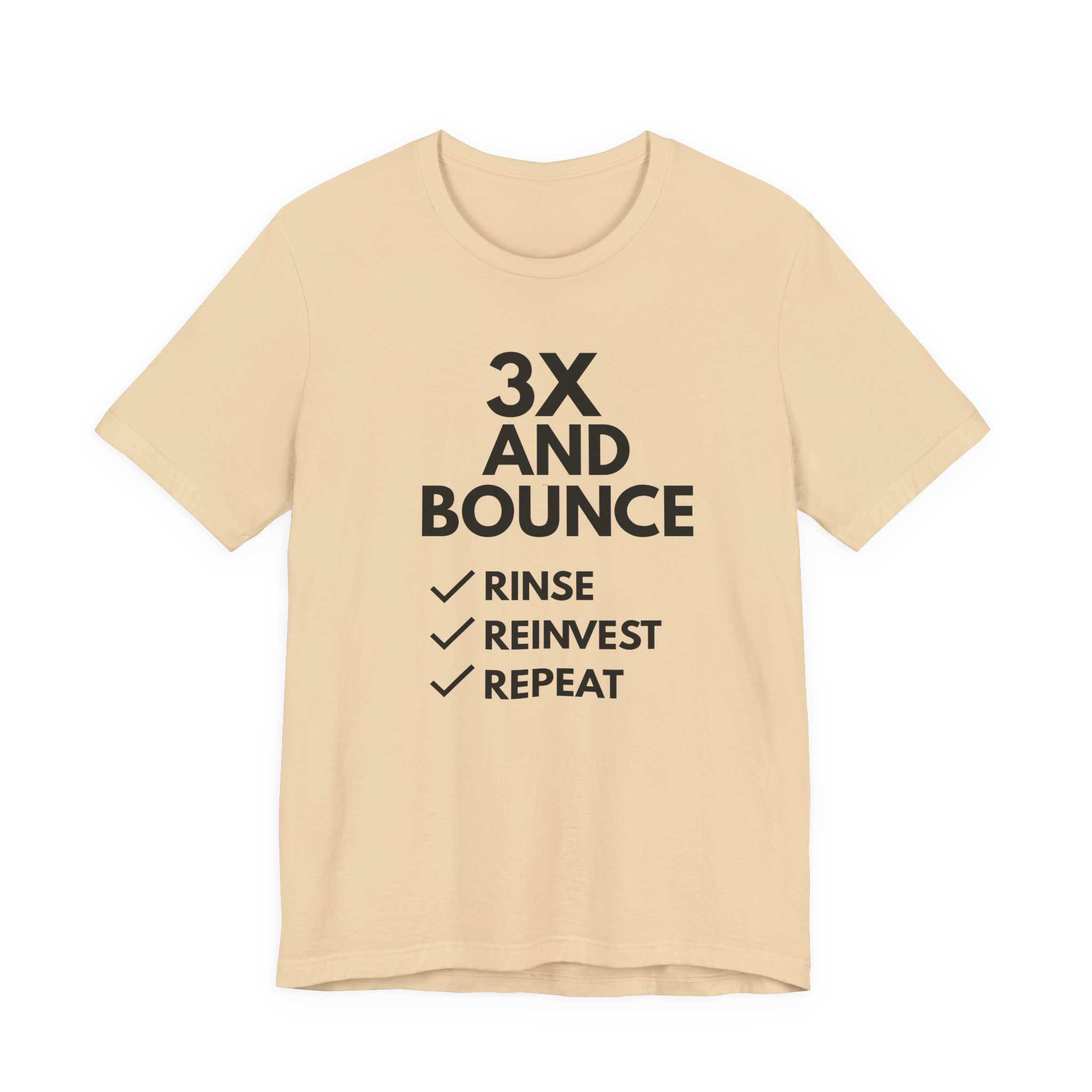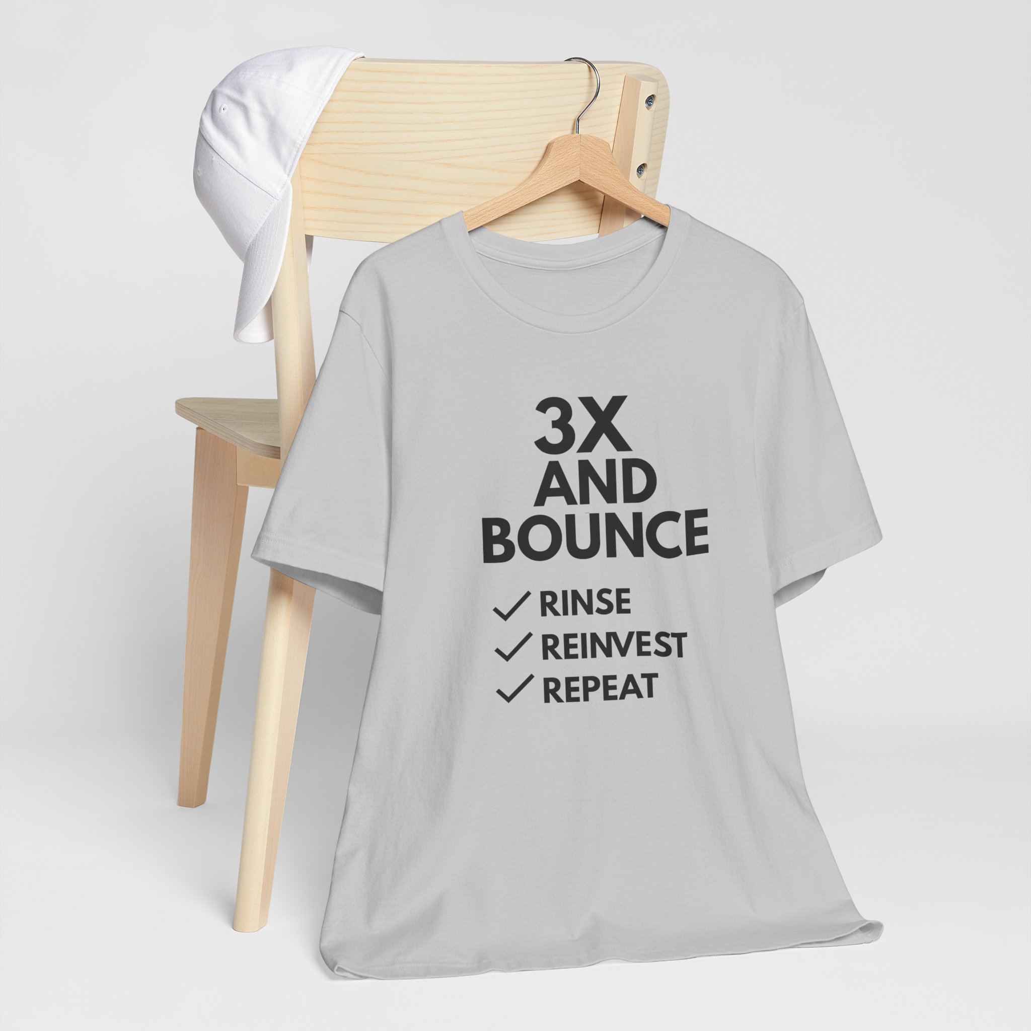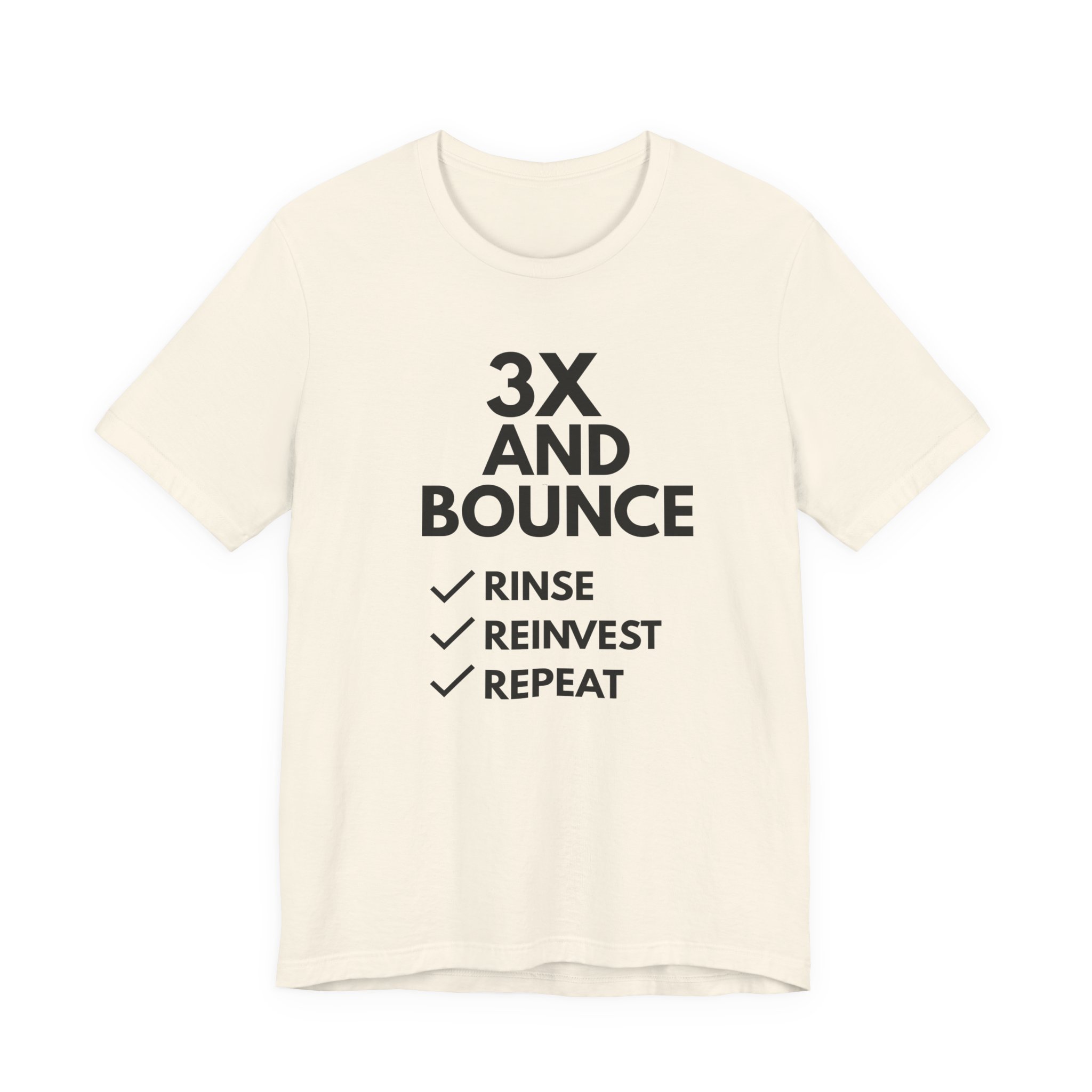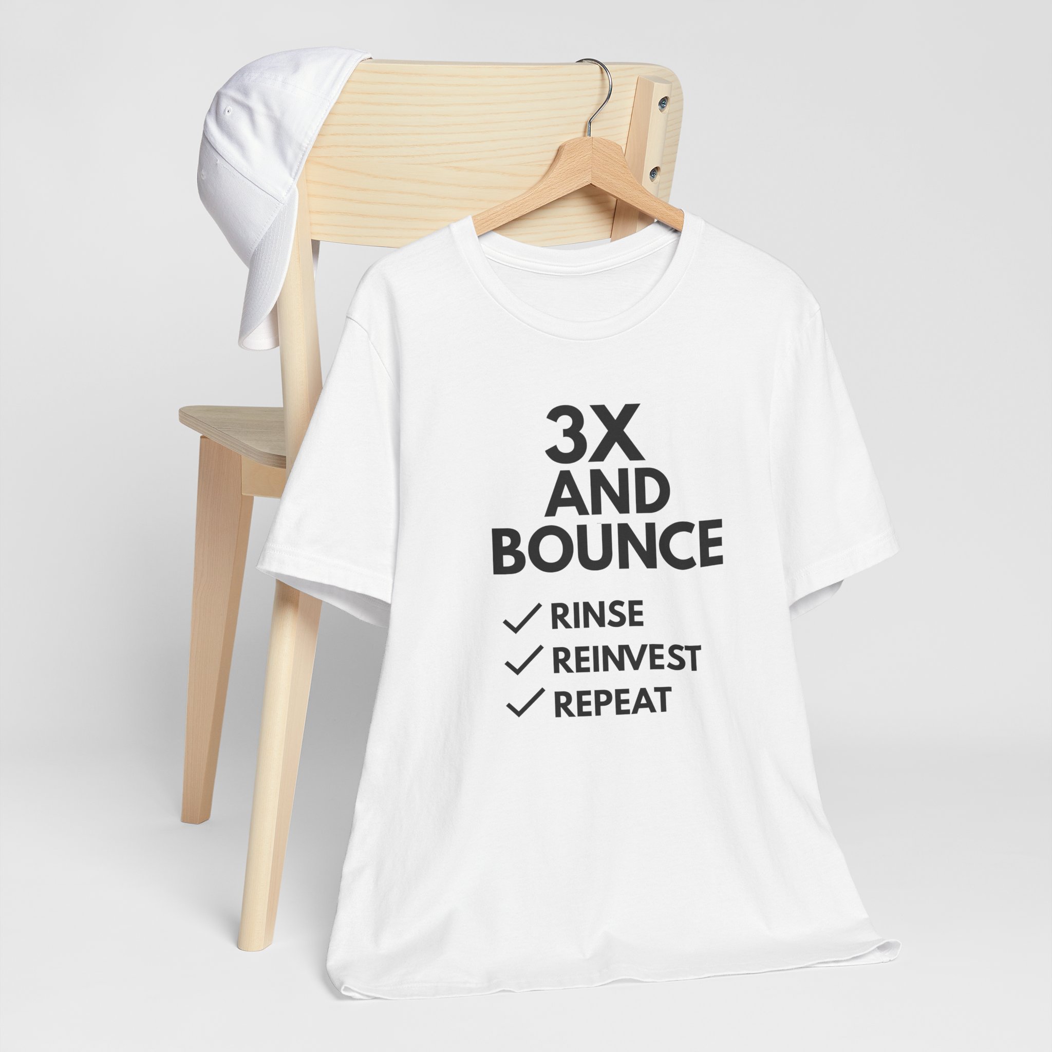 A clean, confident tee featuring “3X and Bounce” in sharp black print. Perfect for bright days and big moves — rinse, reinvest, repeat. Lightweight, motivating, and timeless.
