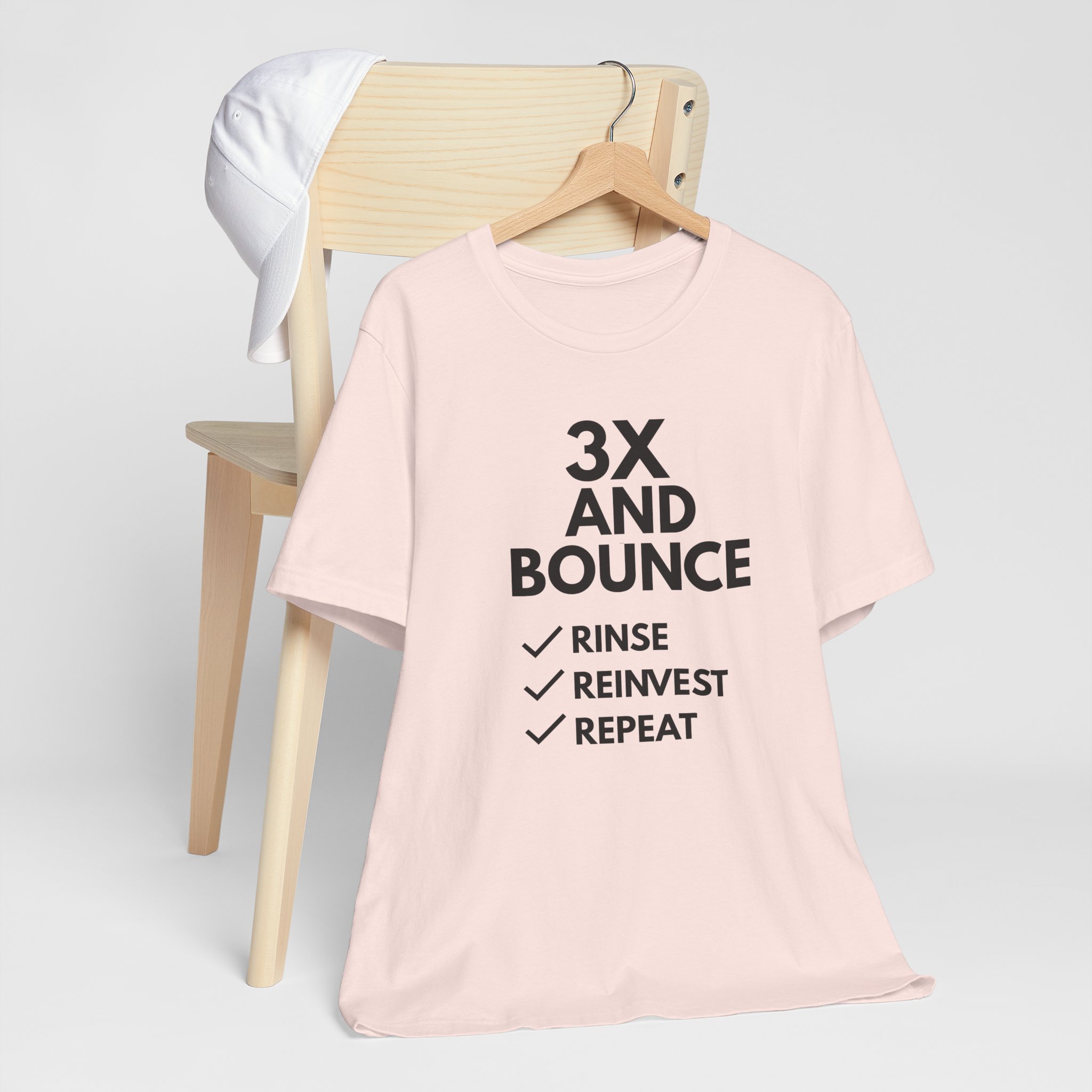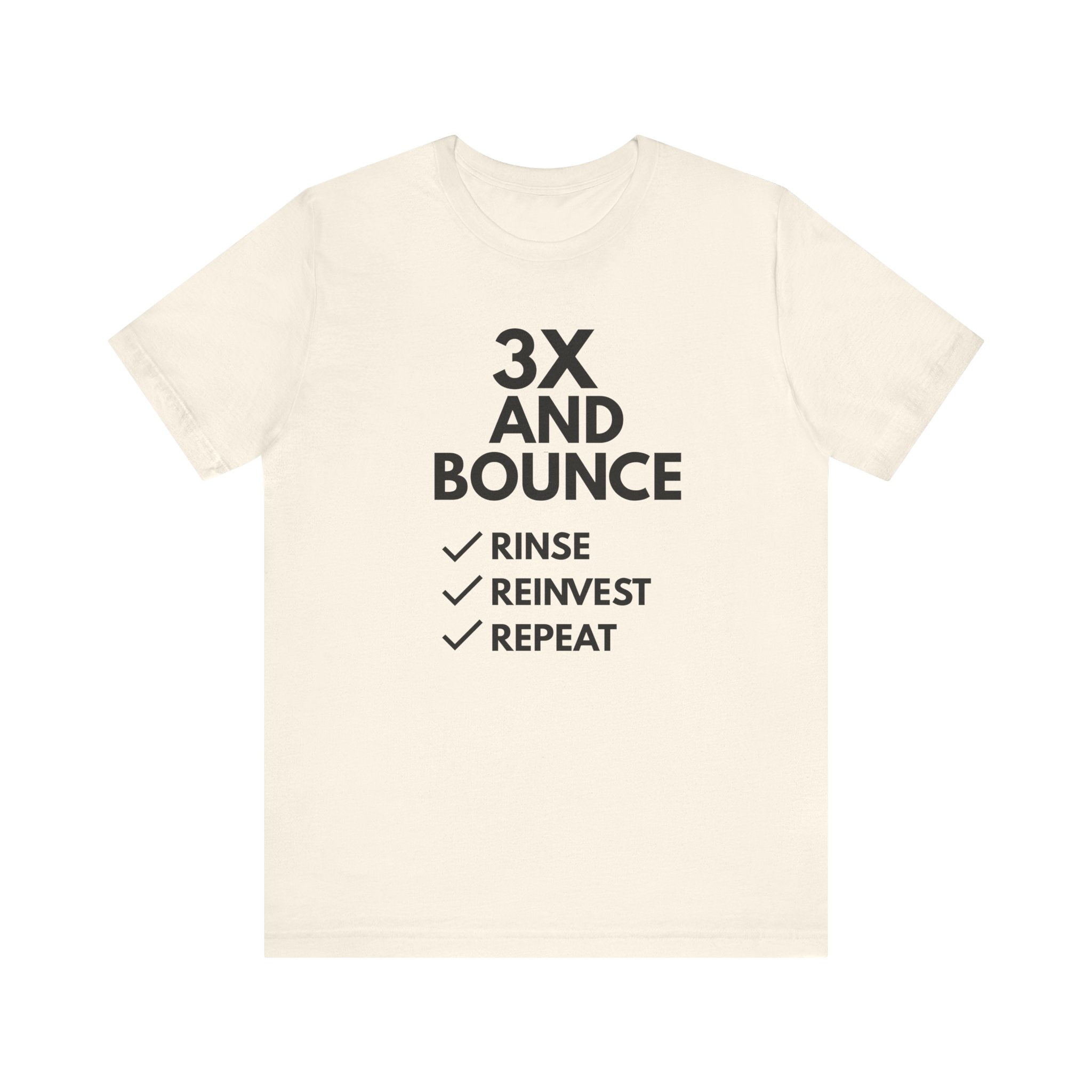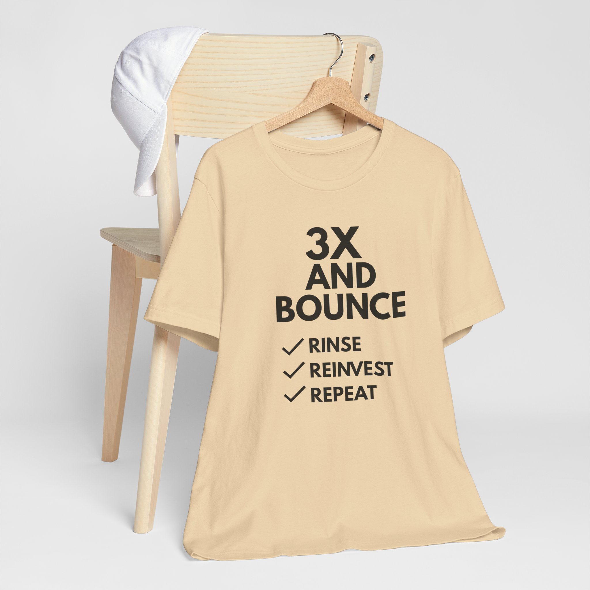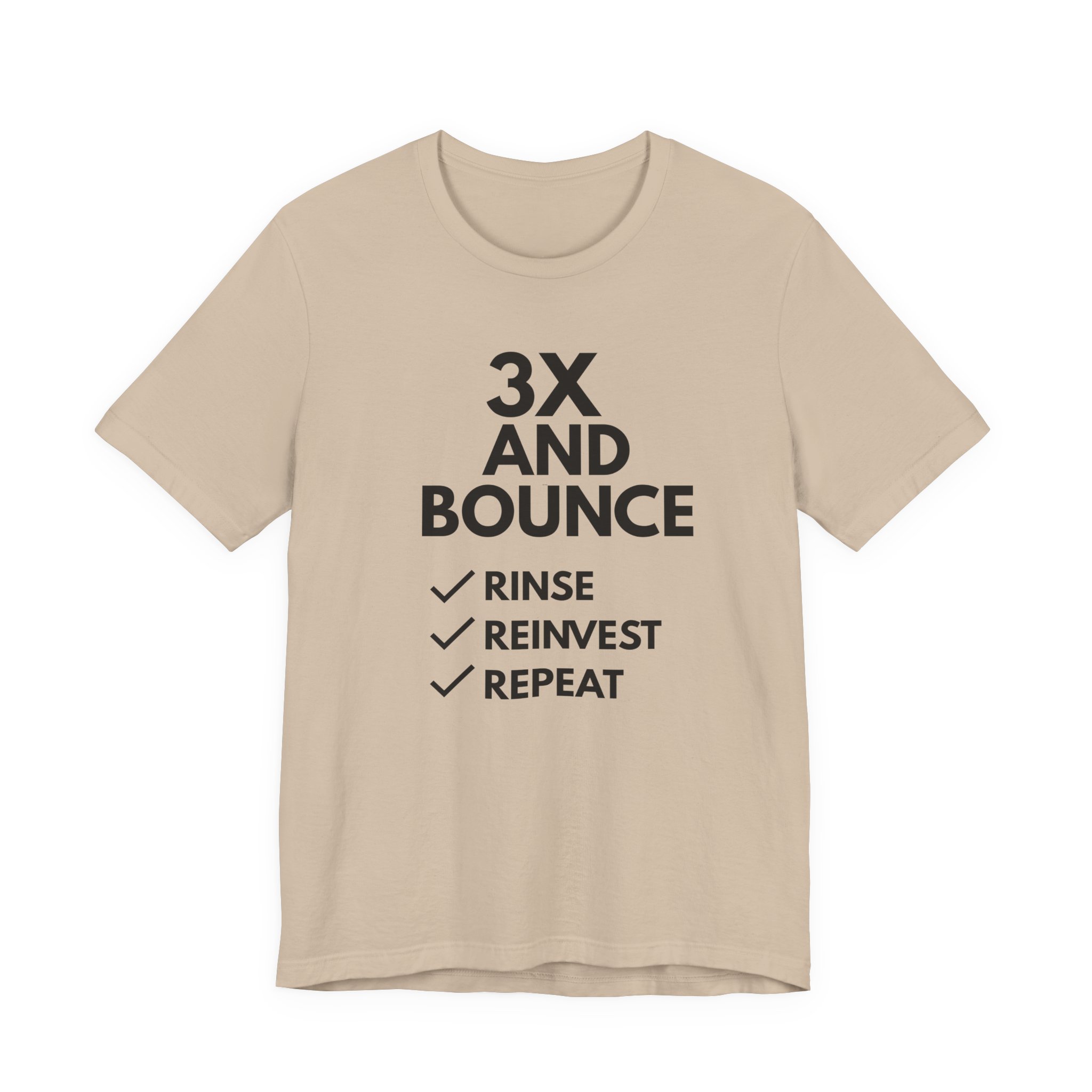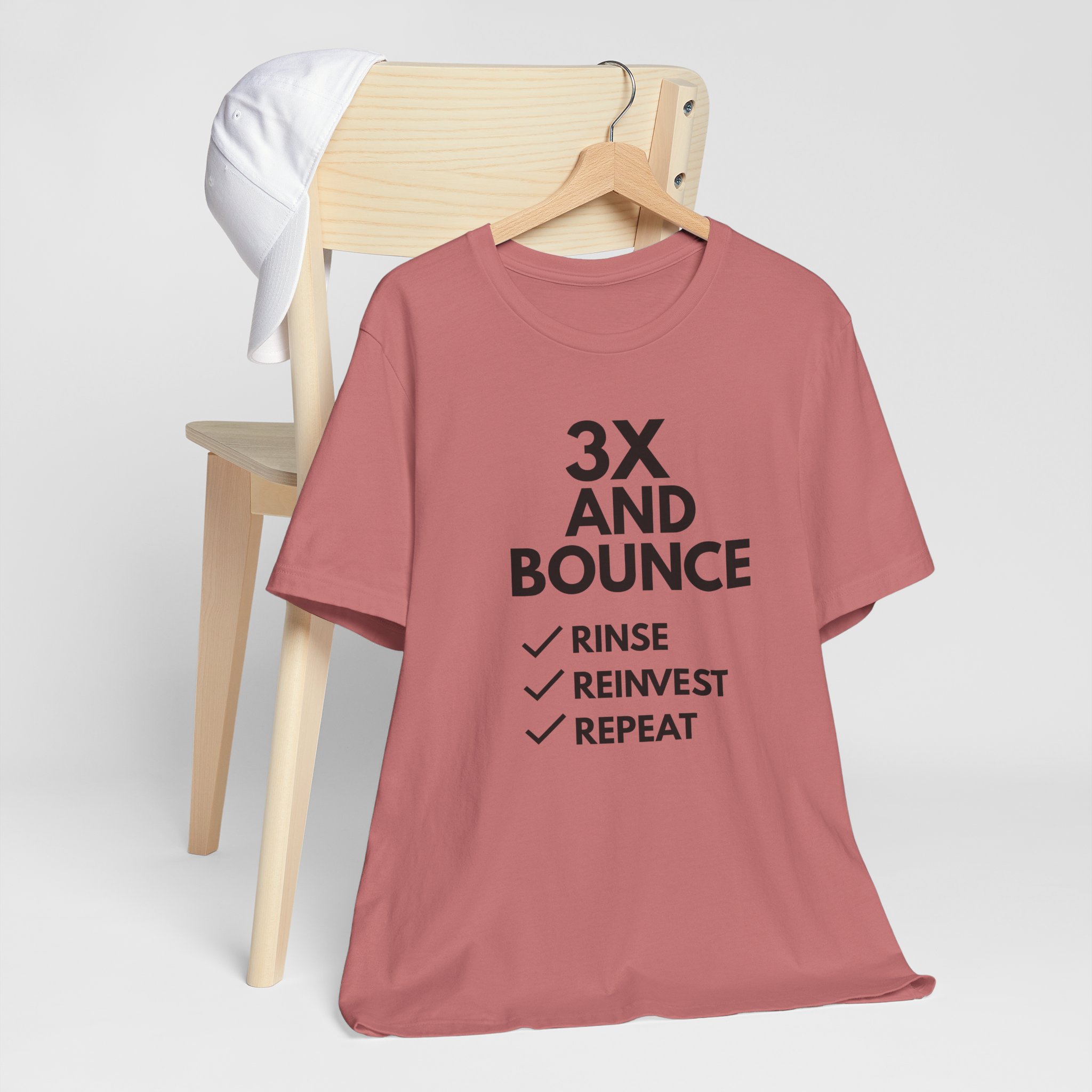 A clean, confident tee featuring “3X and Bounce” in sharp black print. Perfect for bright days and big moves — rinse, reinvest, repeat. Lightweight, motivating, and timeless.