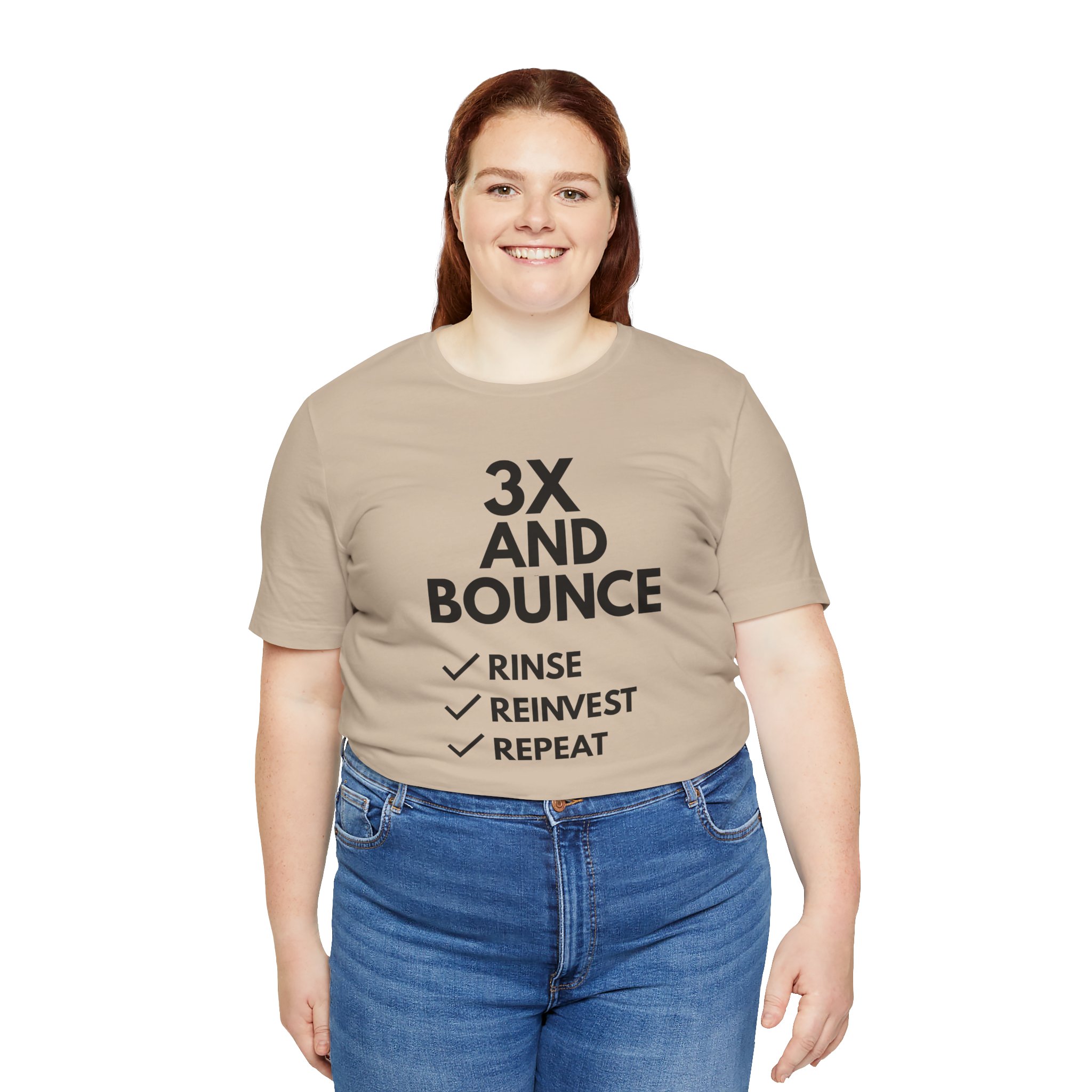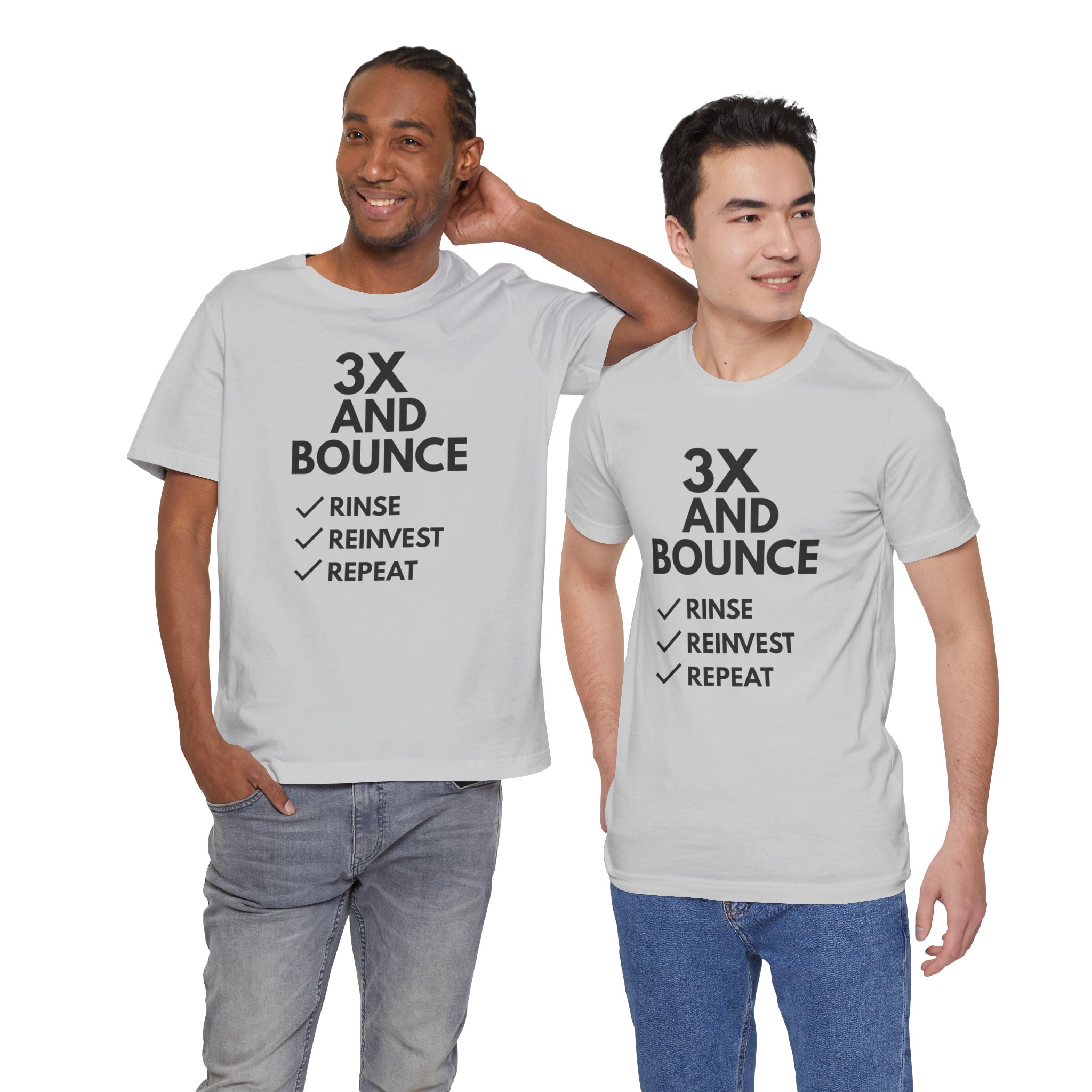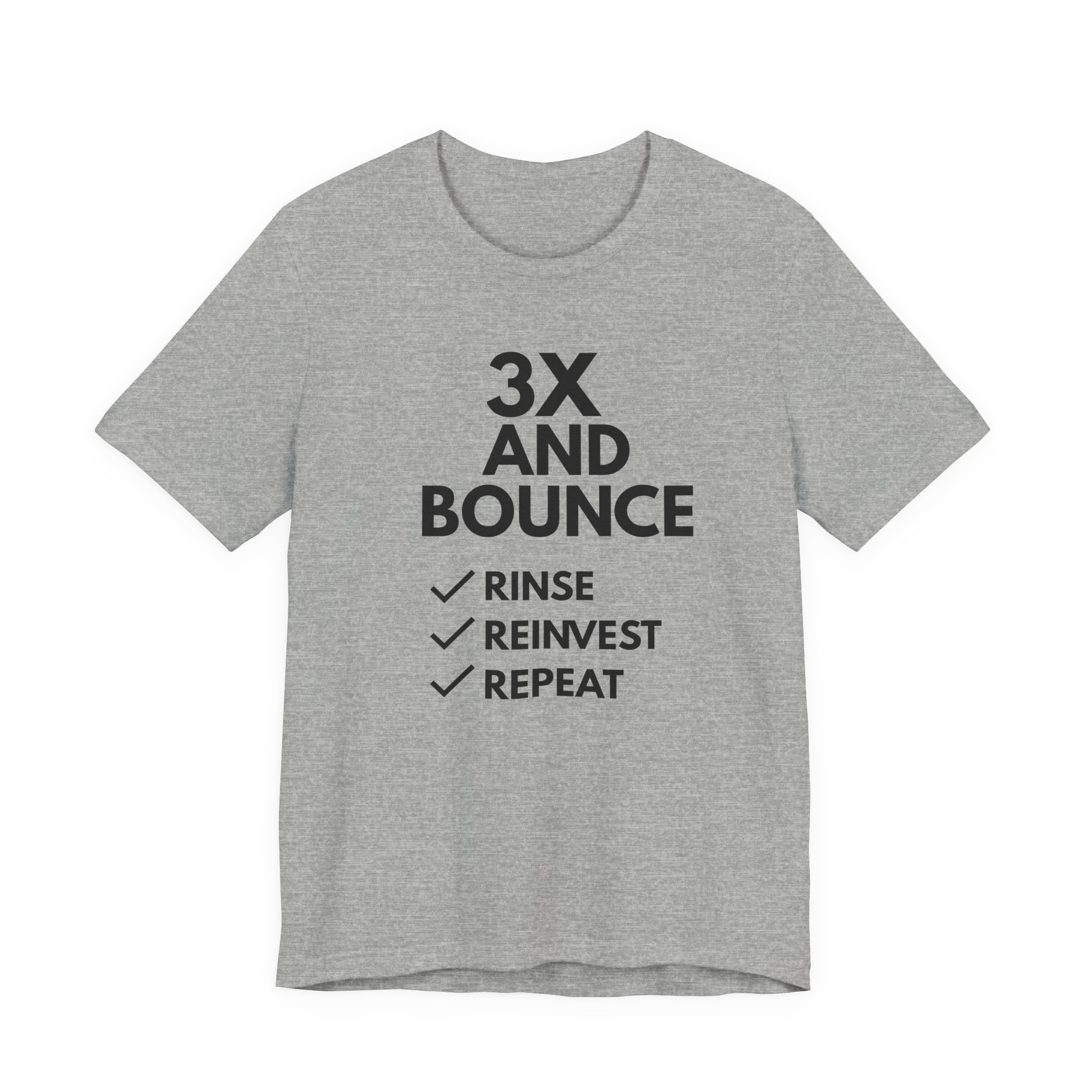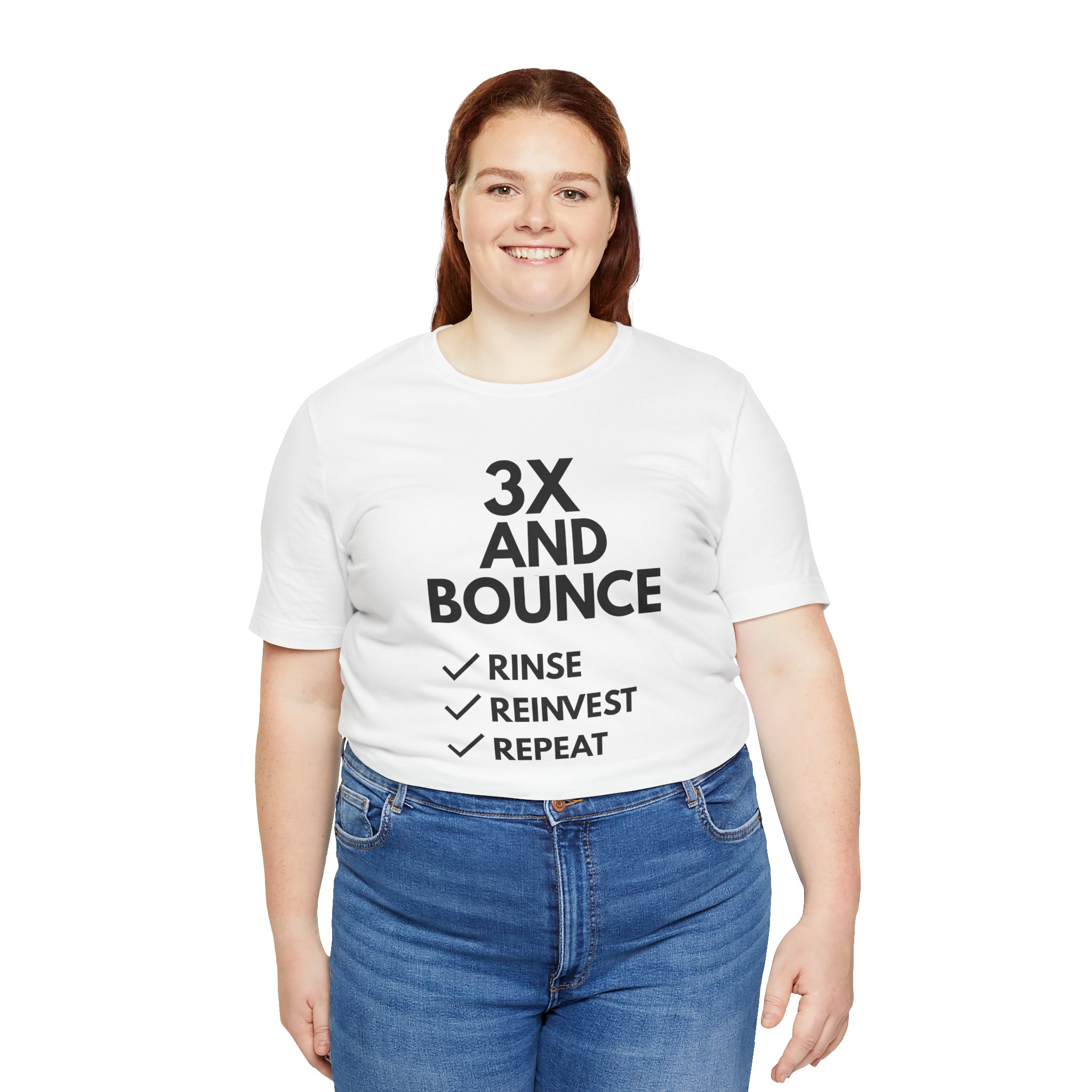A clean, confident tee featuring “3X and Bounce” in sharp black print. Perfect for bright days and big moves — rinse, reinvest, repeat. Lightweight, motivating, and timeless.