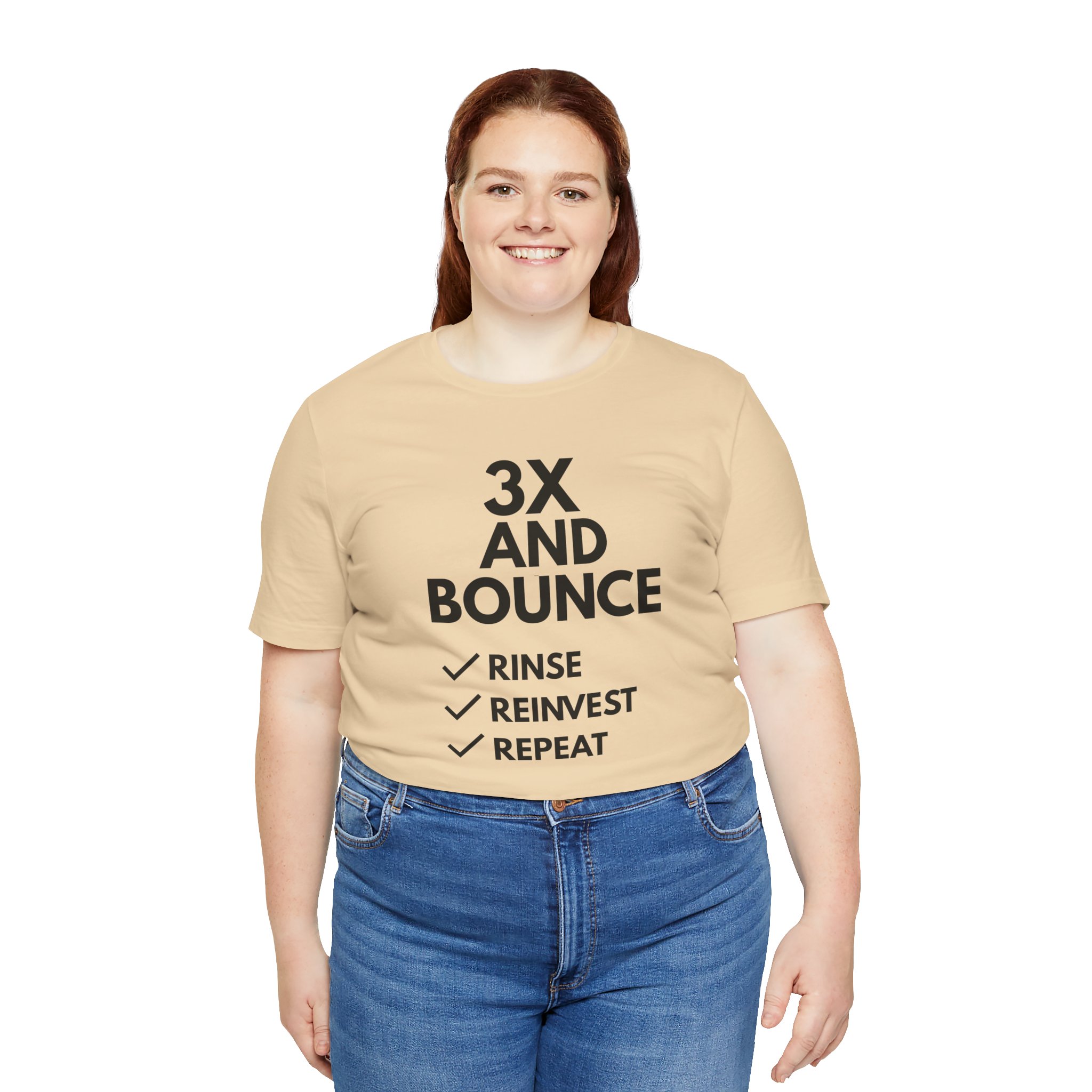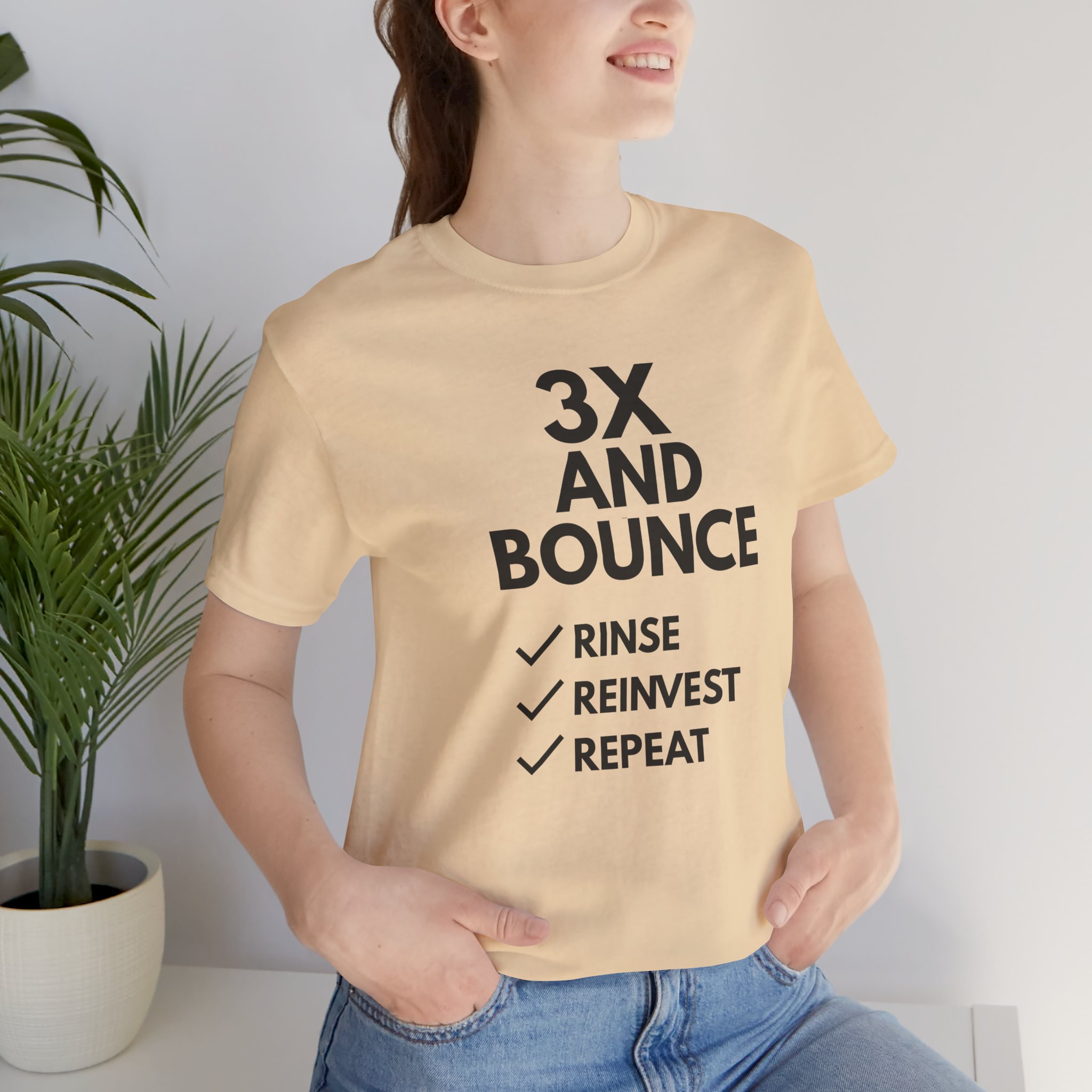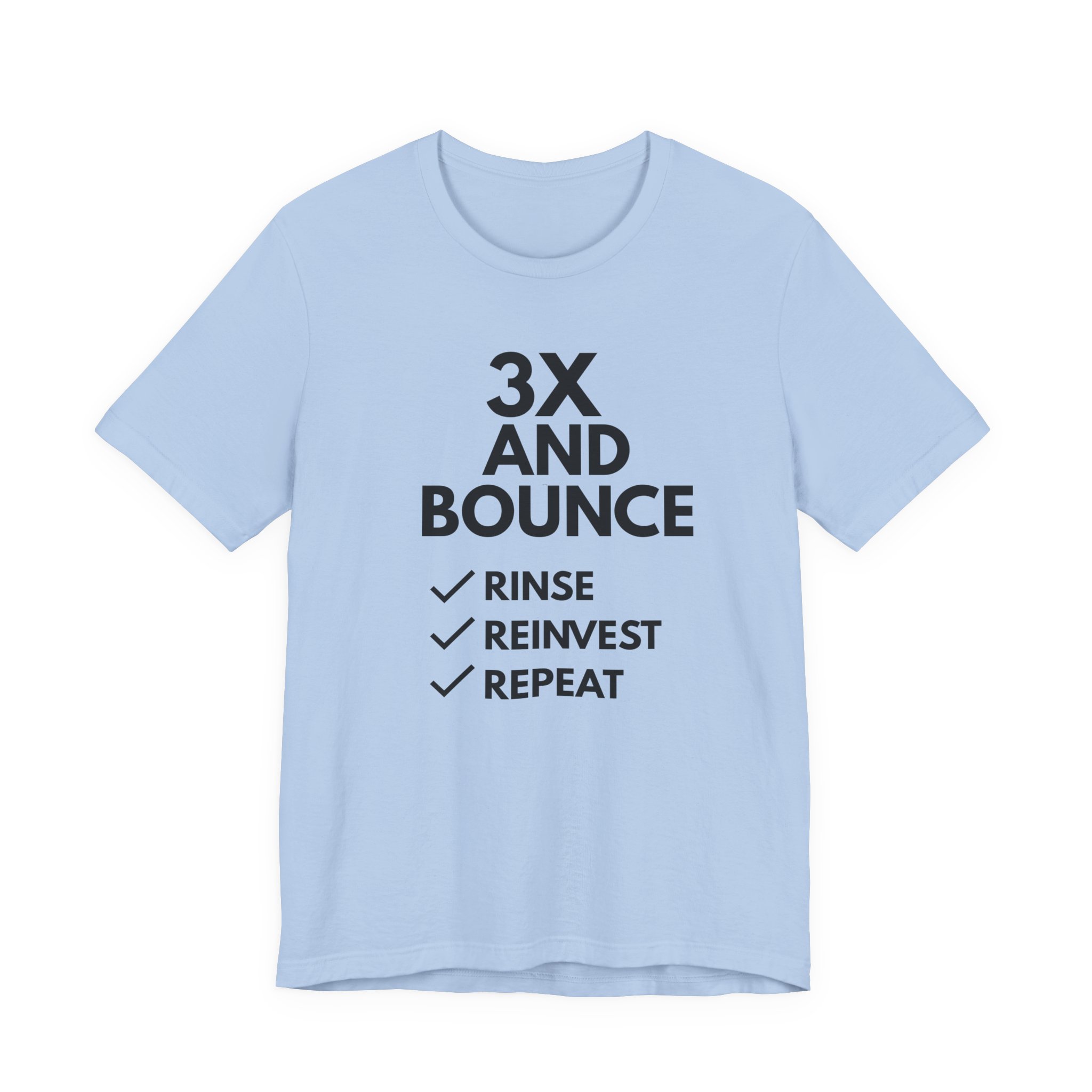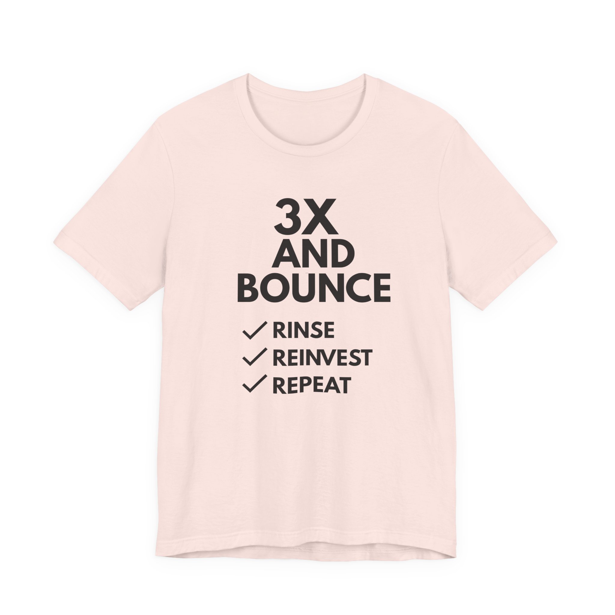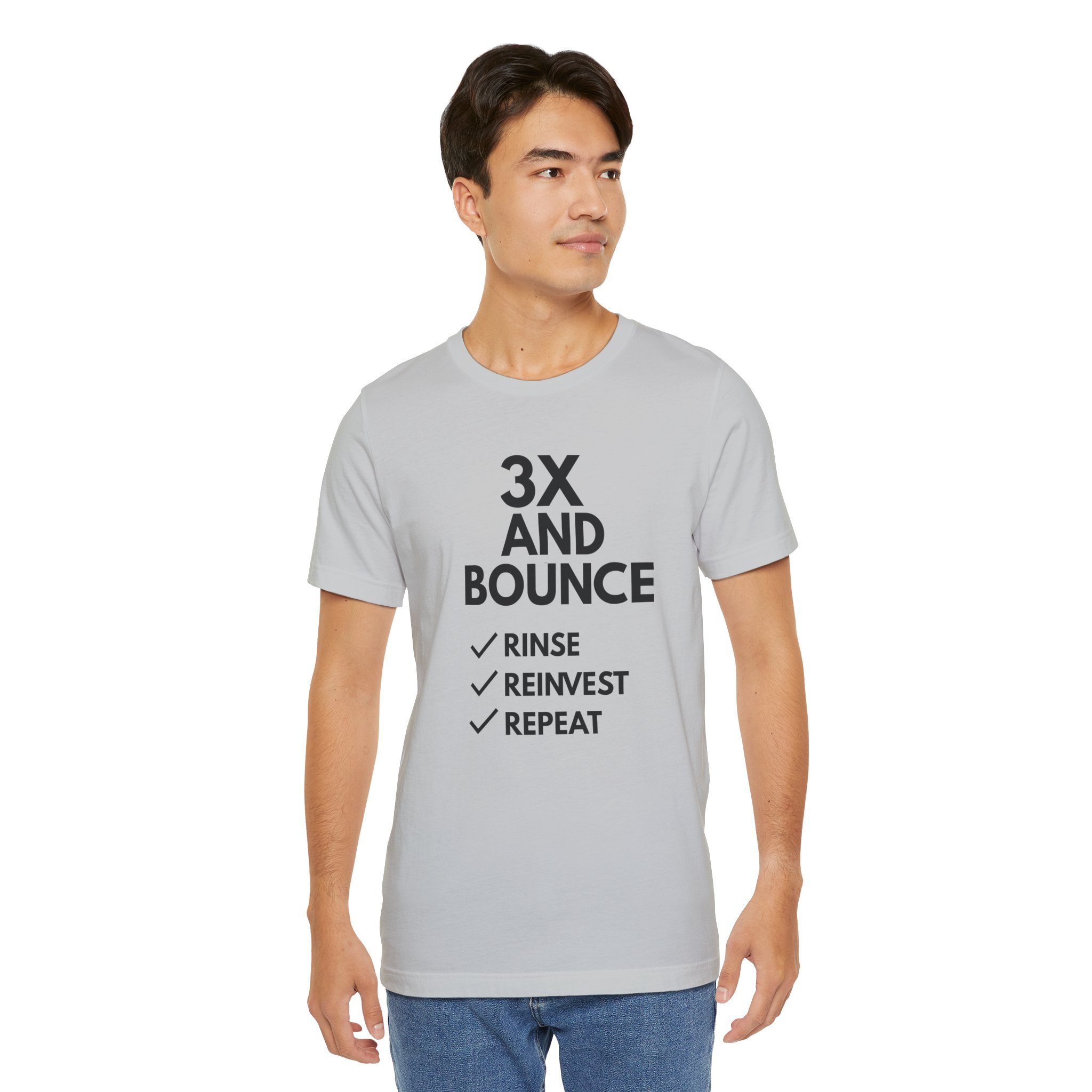 A clean, confident tee featuring “3X and Bounce” in sharp black print. Perfect for bright days and big moves — rinse, reinvest, repeat. Lightweight, motivating, and timeless.