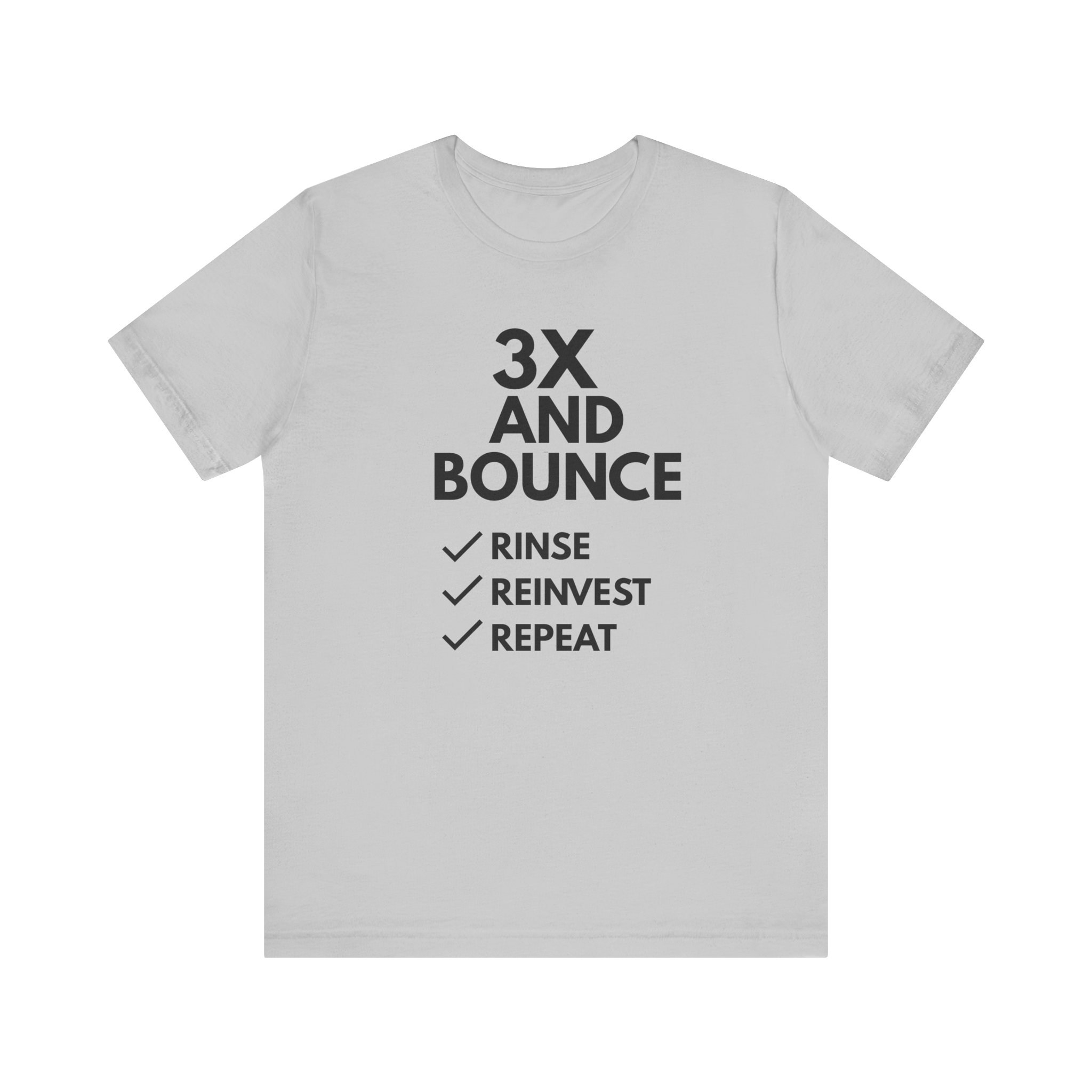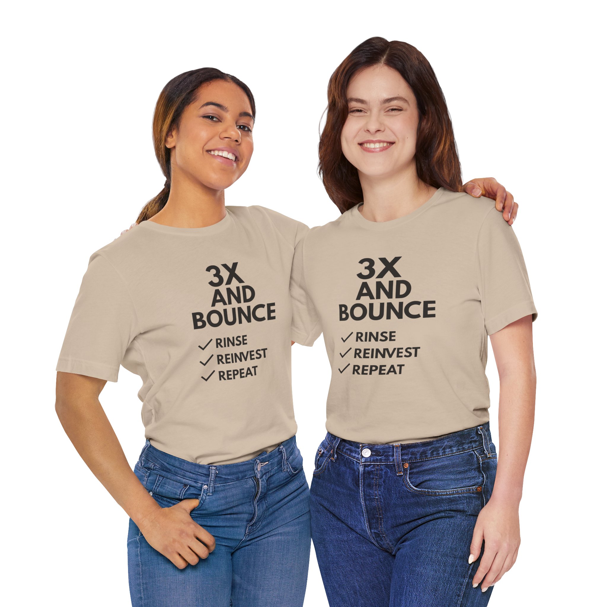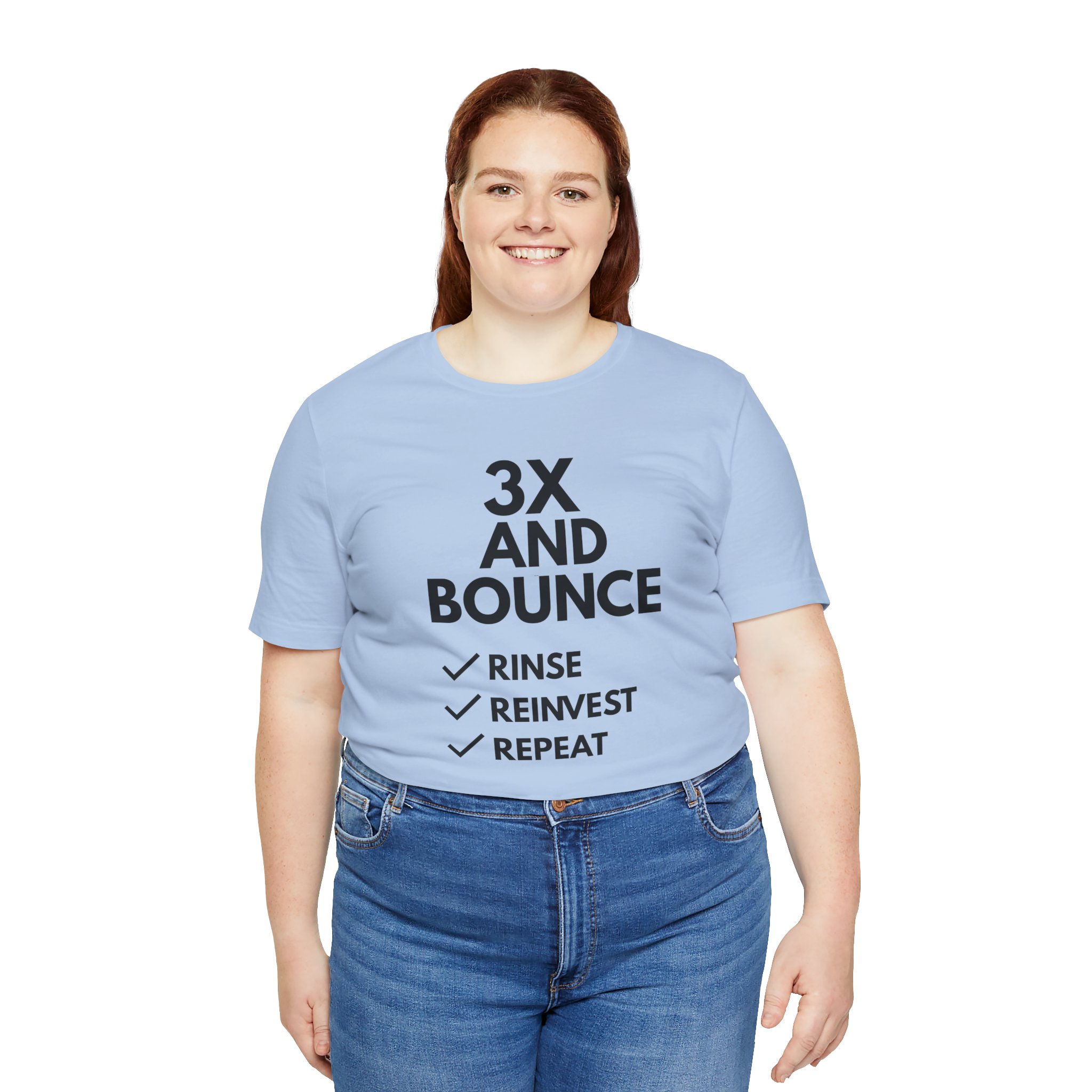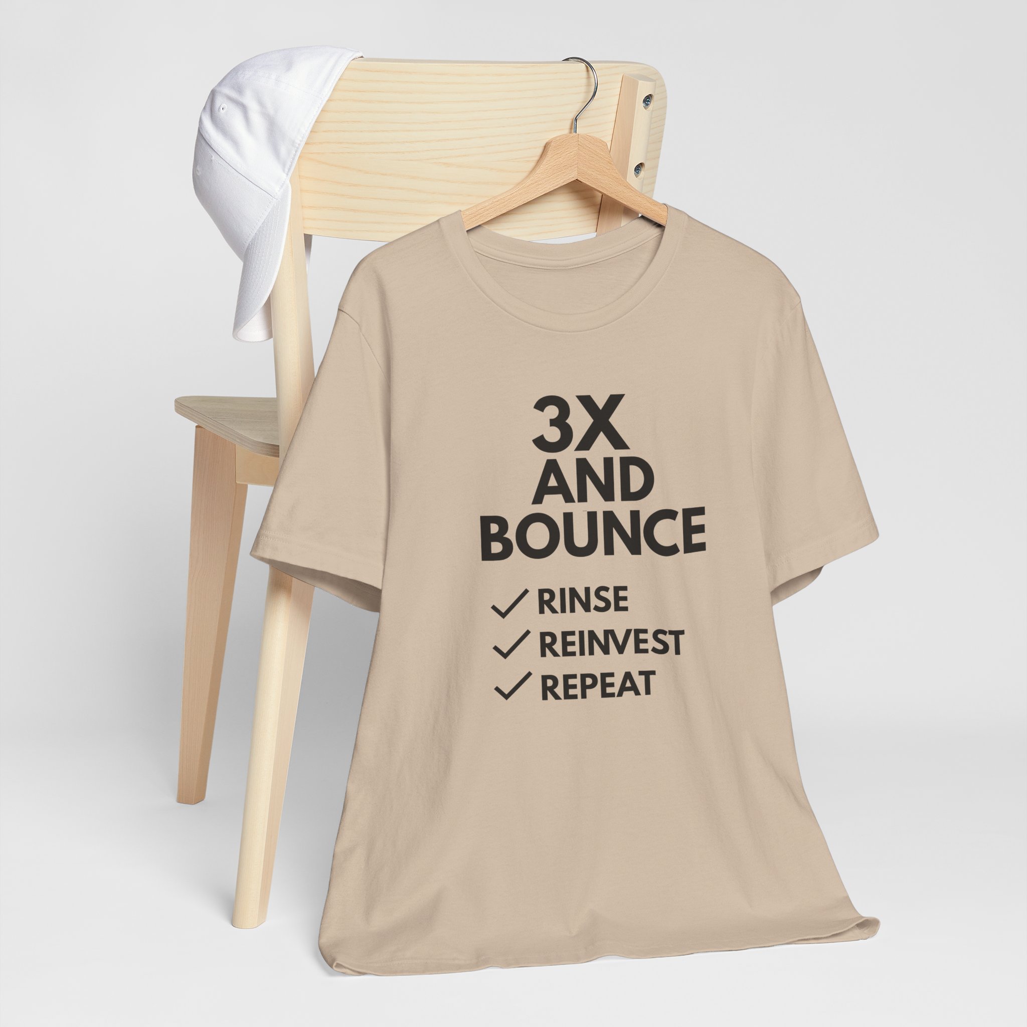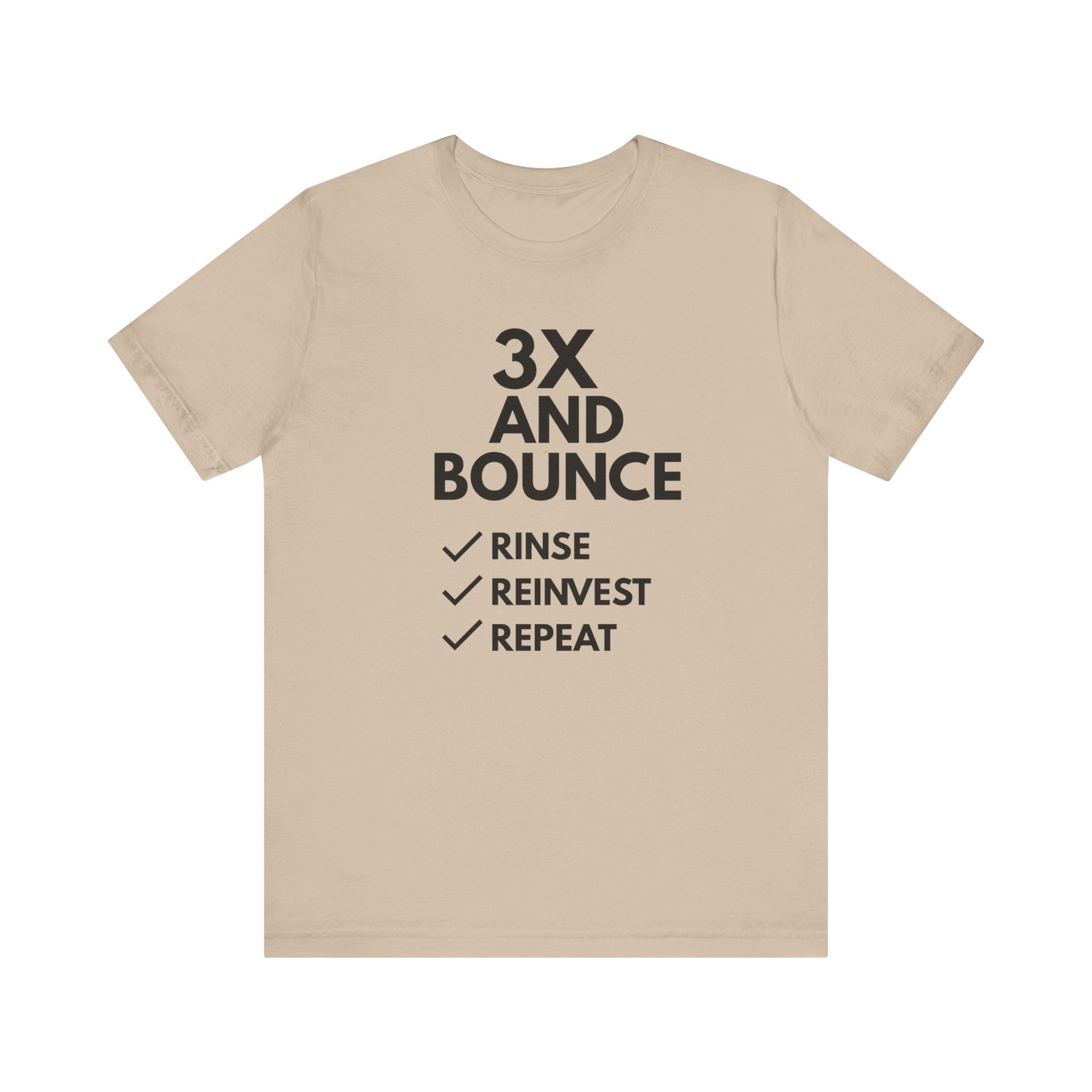 A clean, confident tee featuring “3X and Bounce” in sharp black print. Perfect for bright days and big moves — rinse, reinvest, repeat. Lightweight, motivating, and timeless.