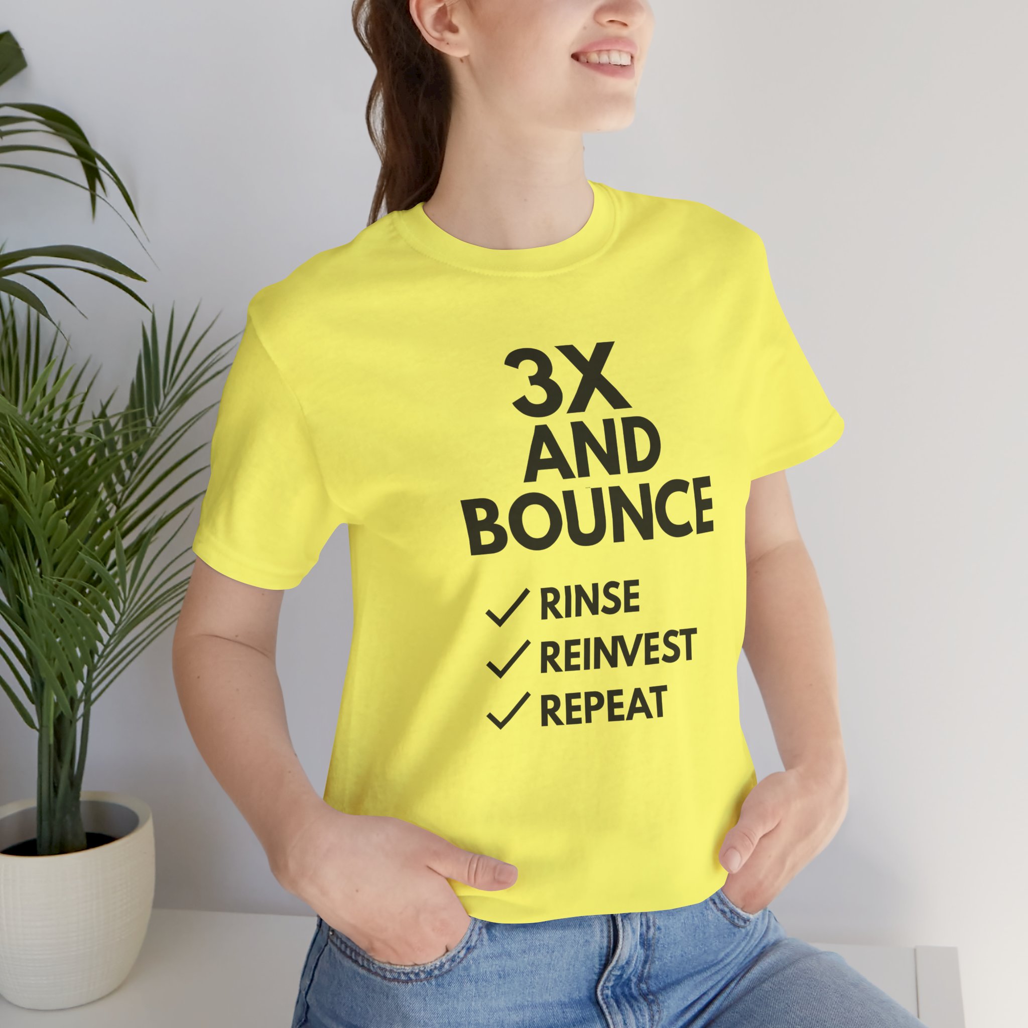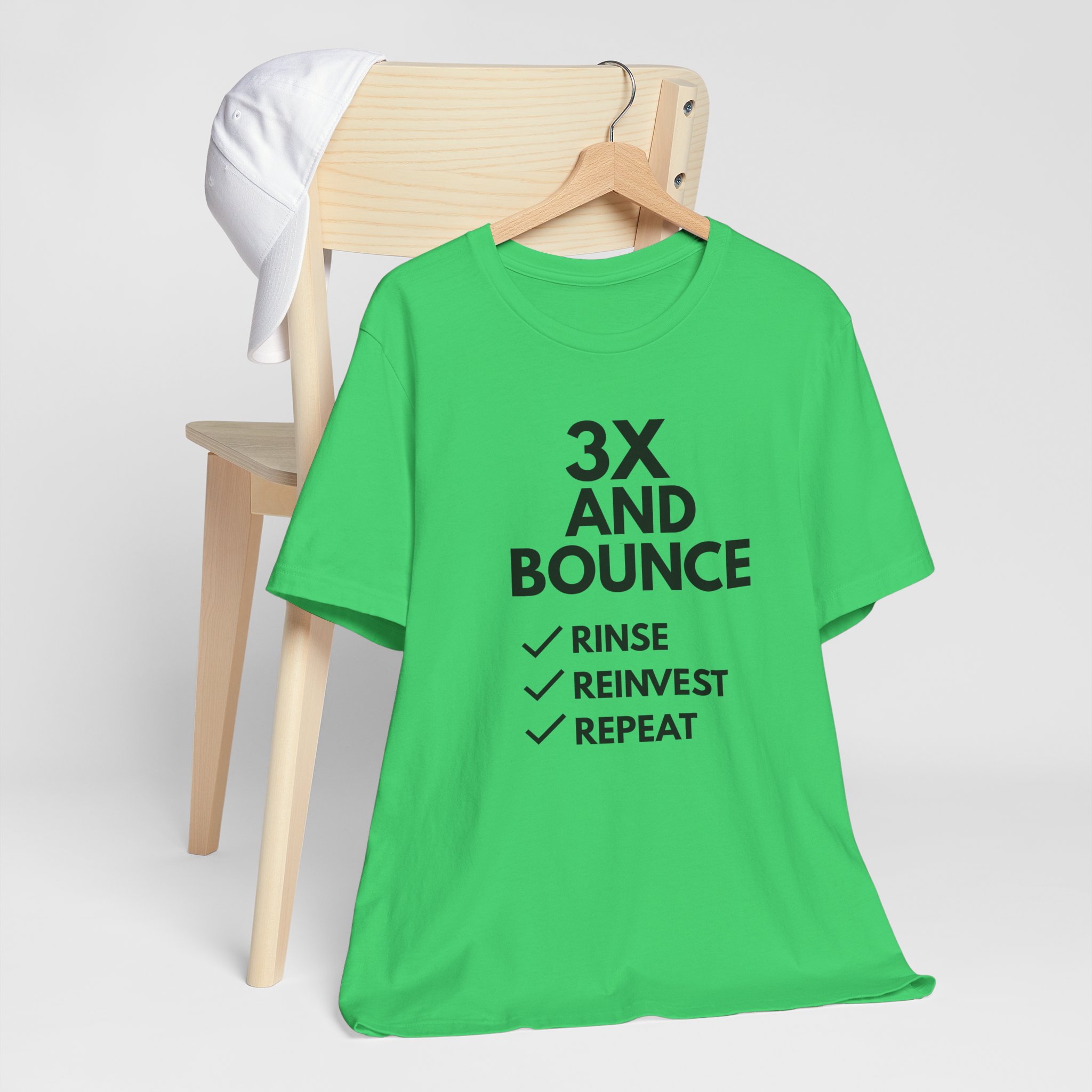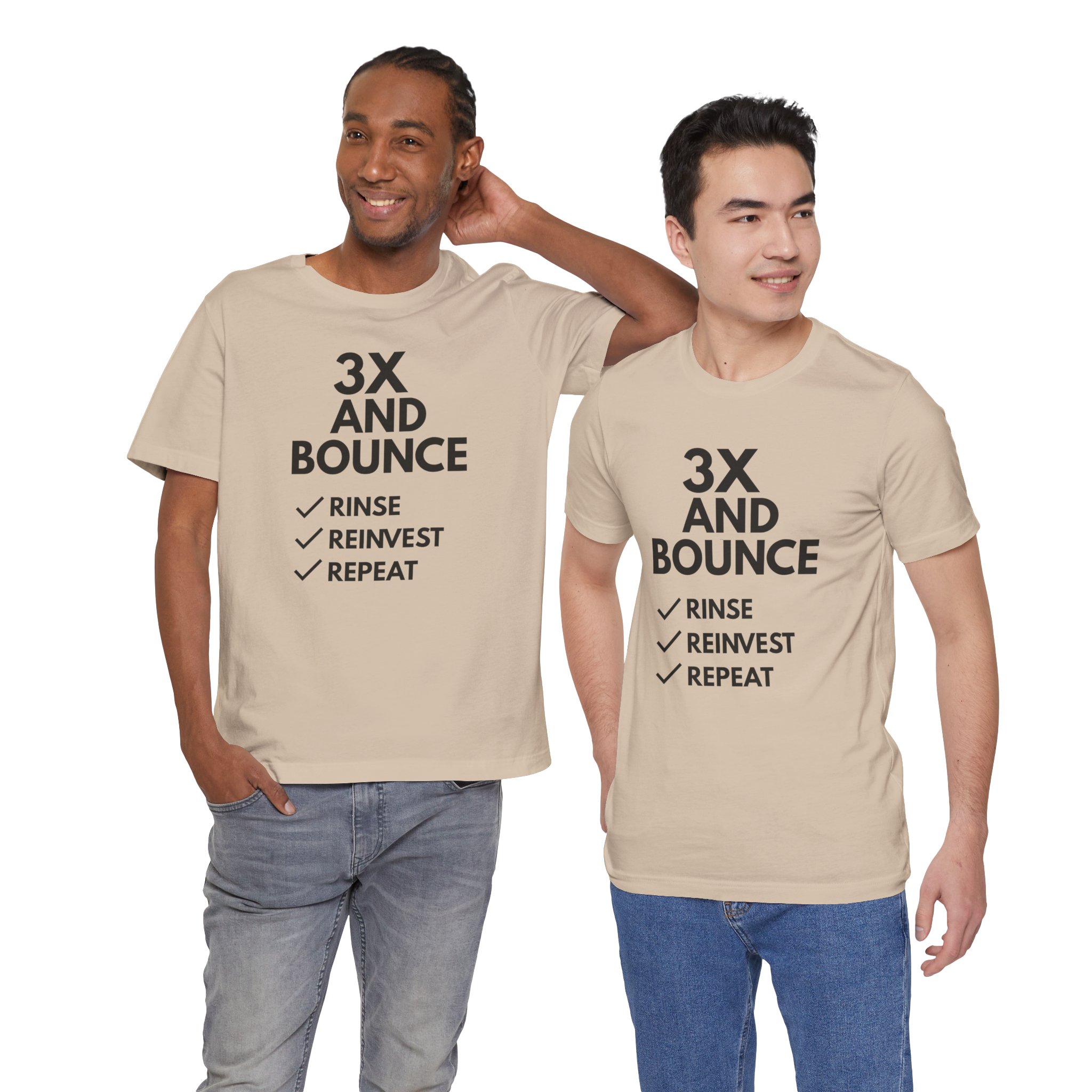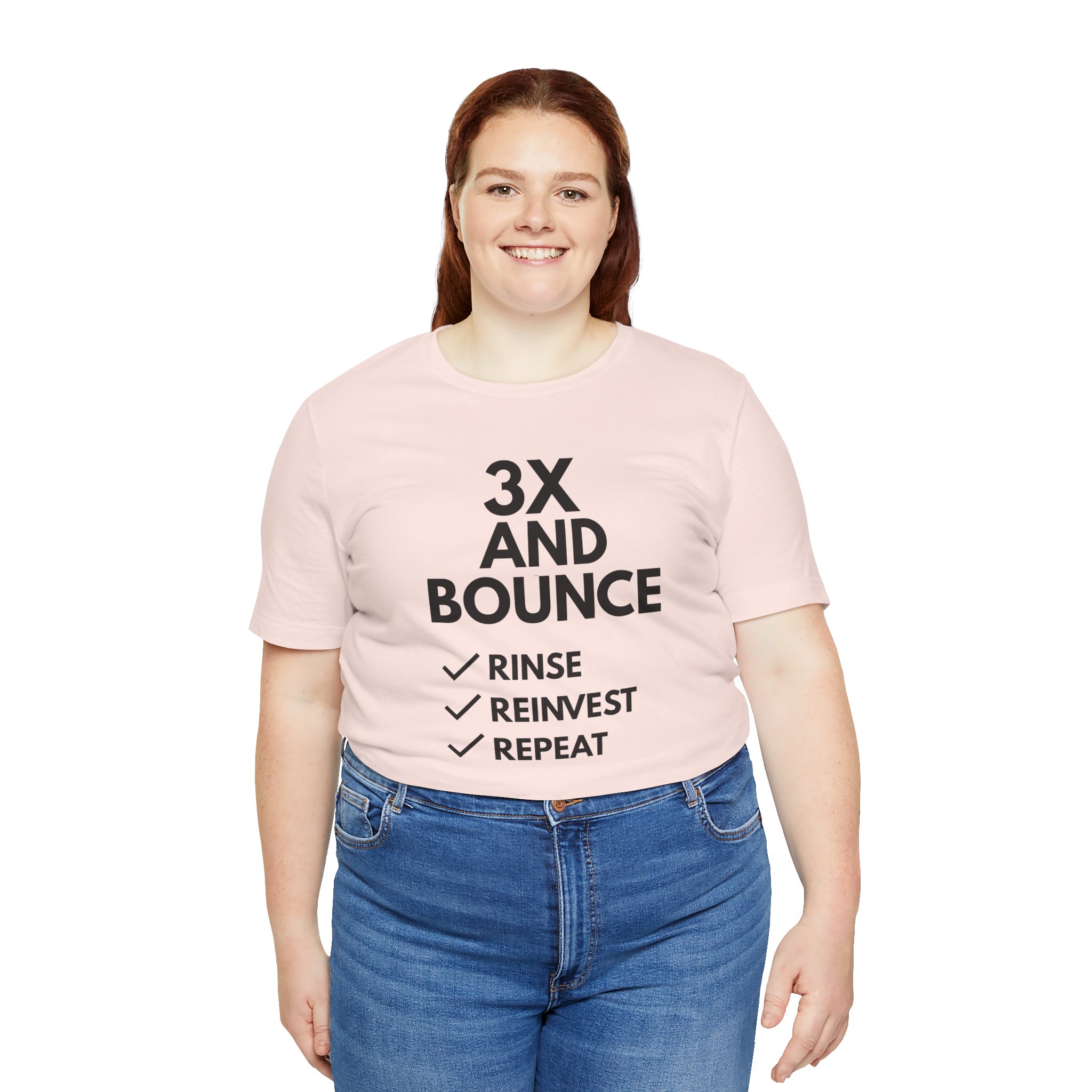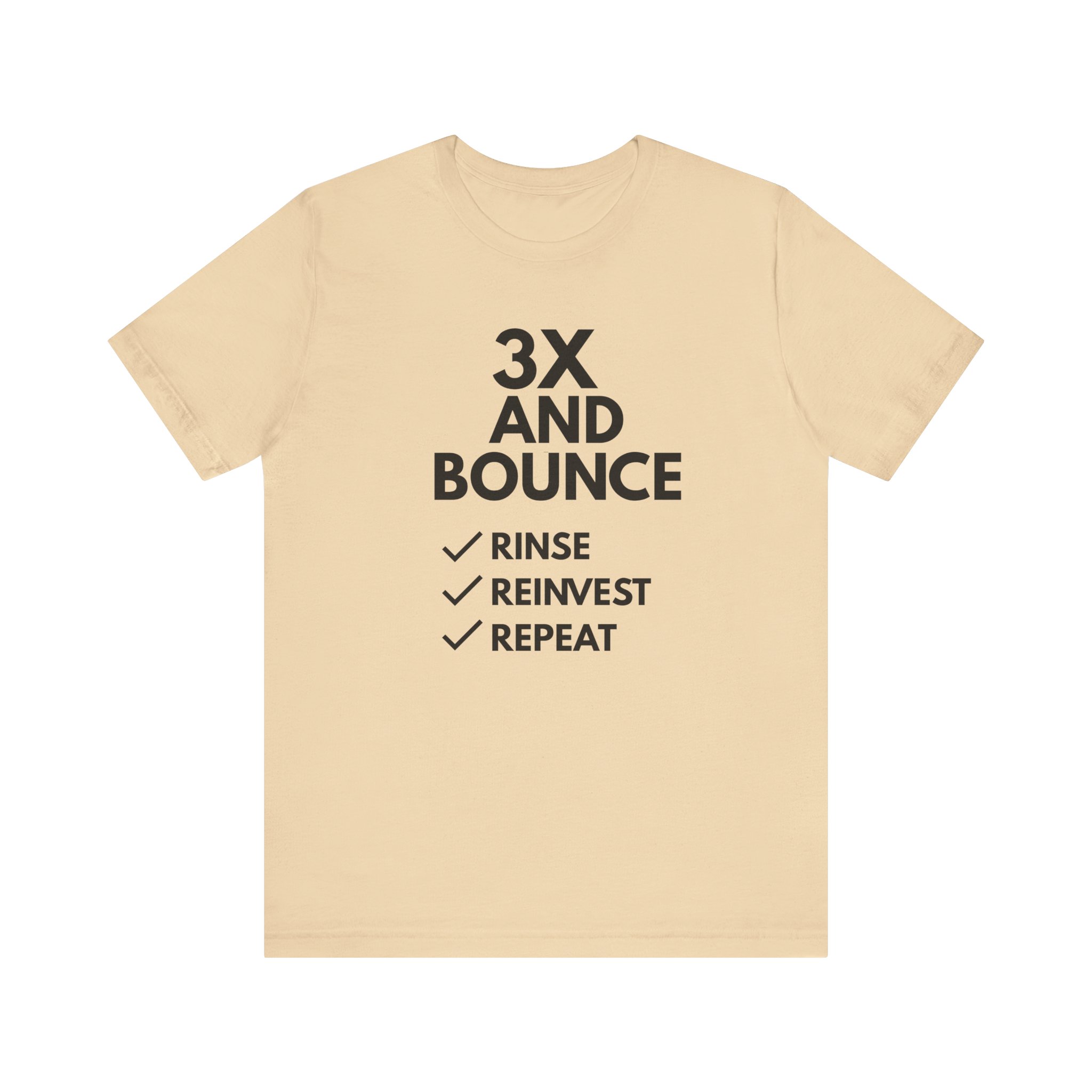 A clean, confident tee featuring “3X and Bounce” in sharp black print. Perfect for bright days and big moves — rinse, reinvest, repeat. Lightweight, motivating, and timeless.