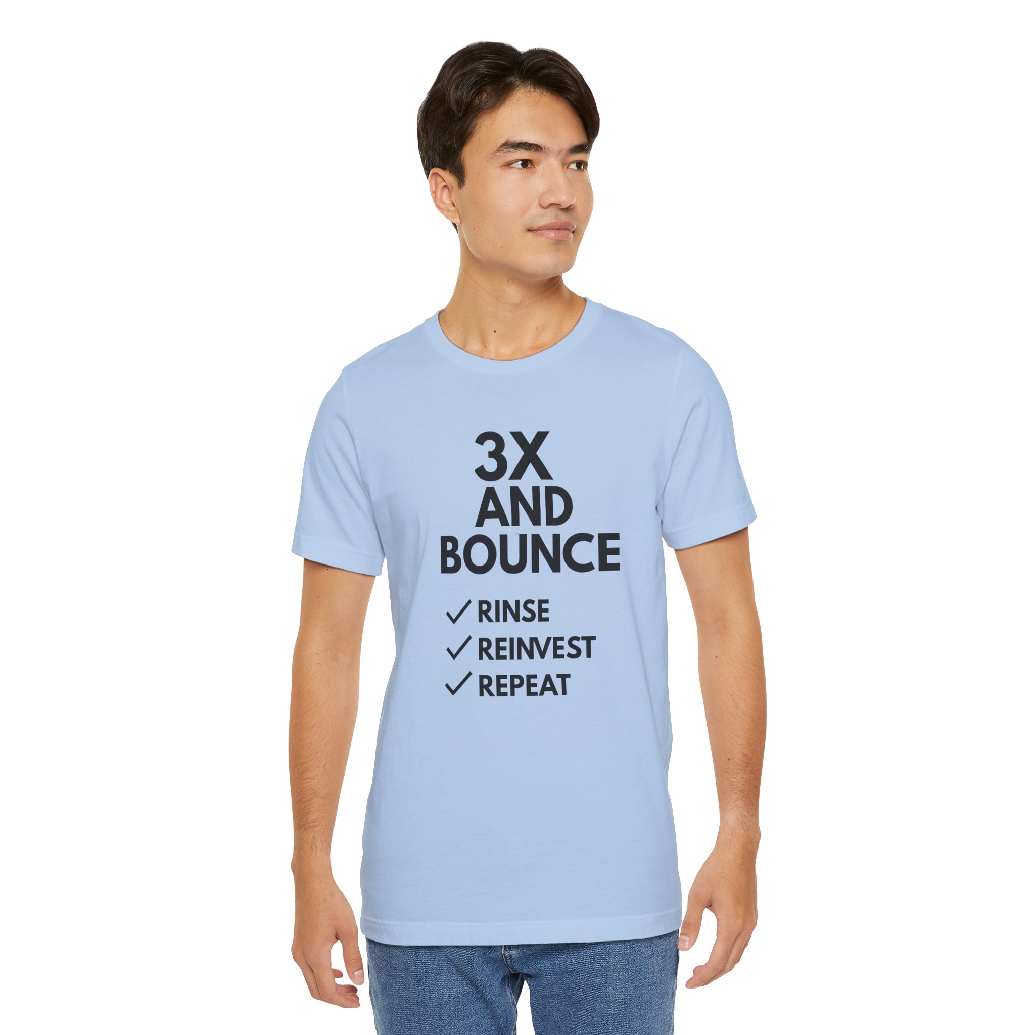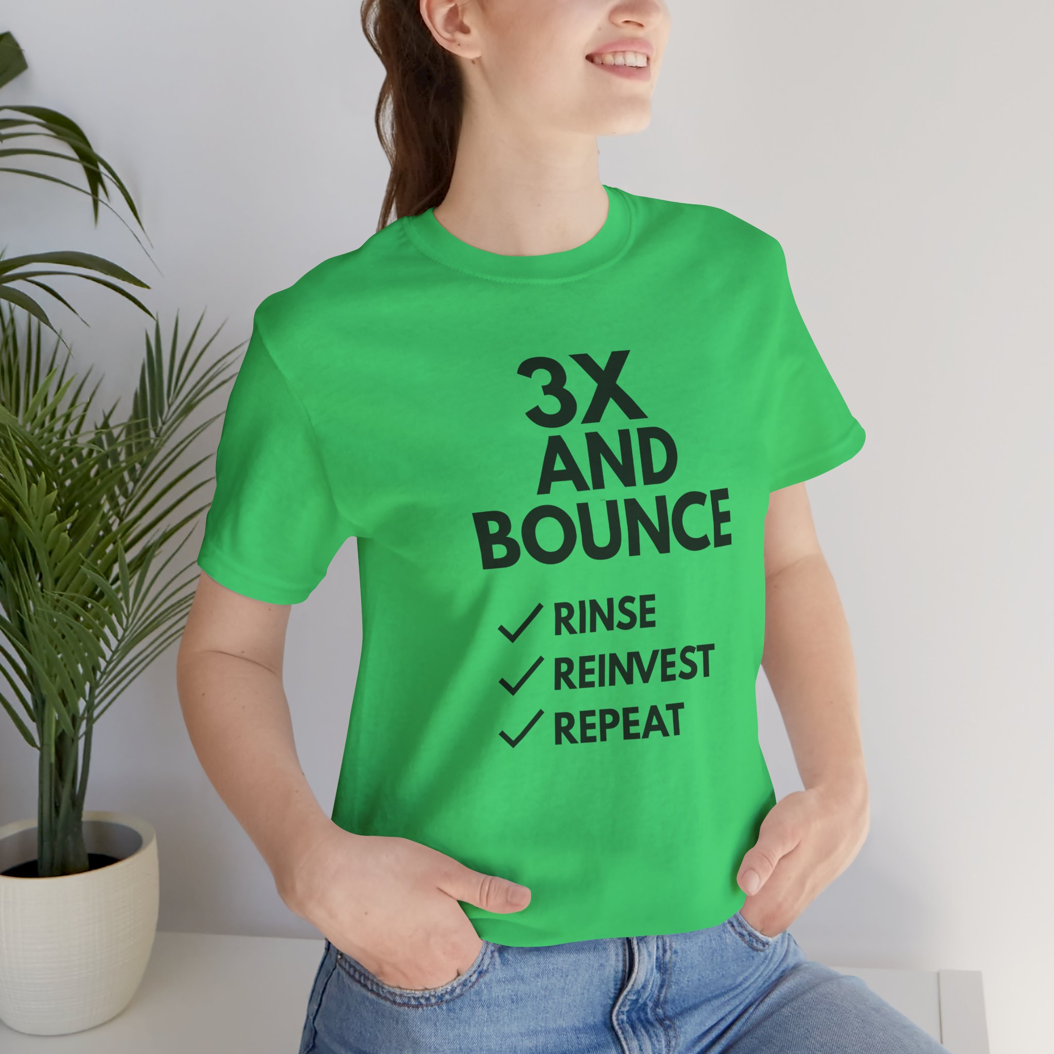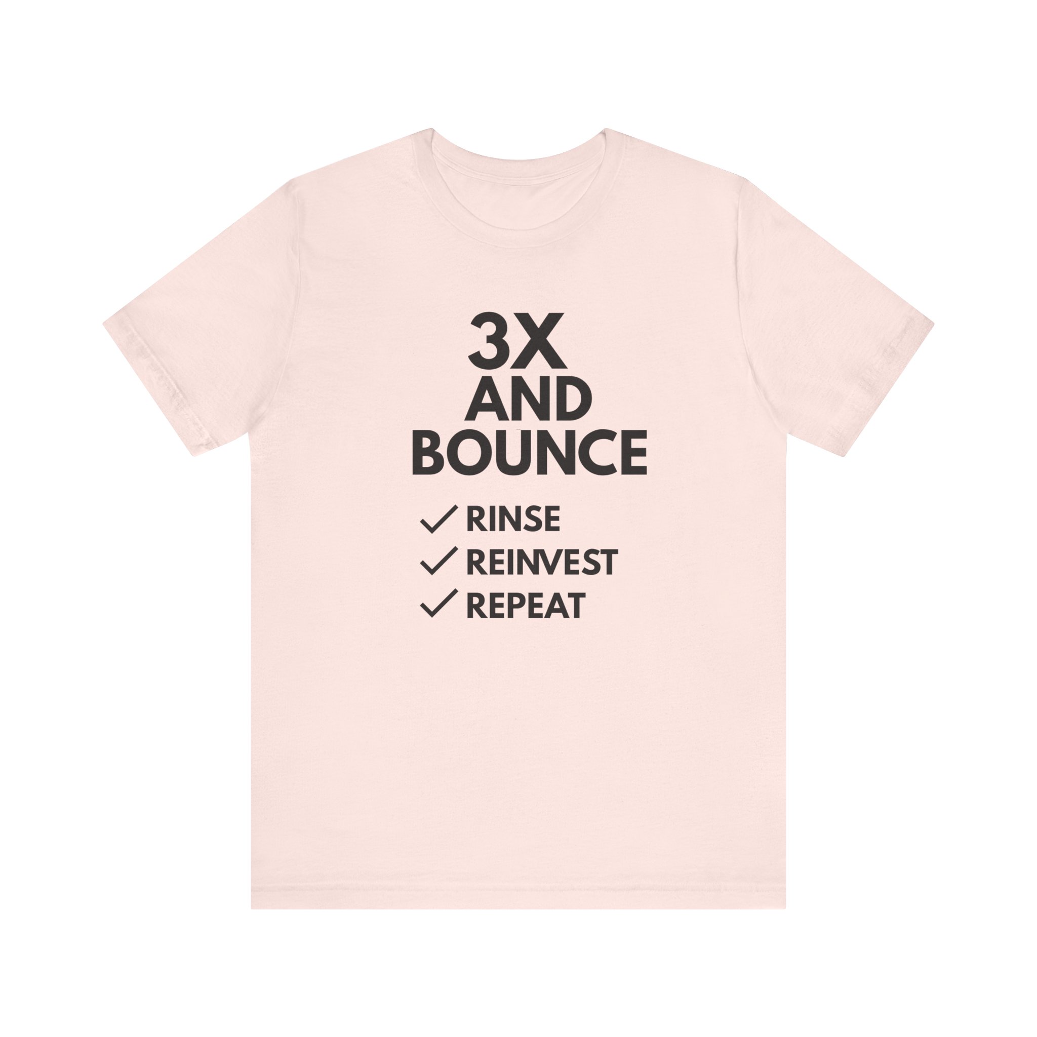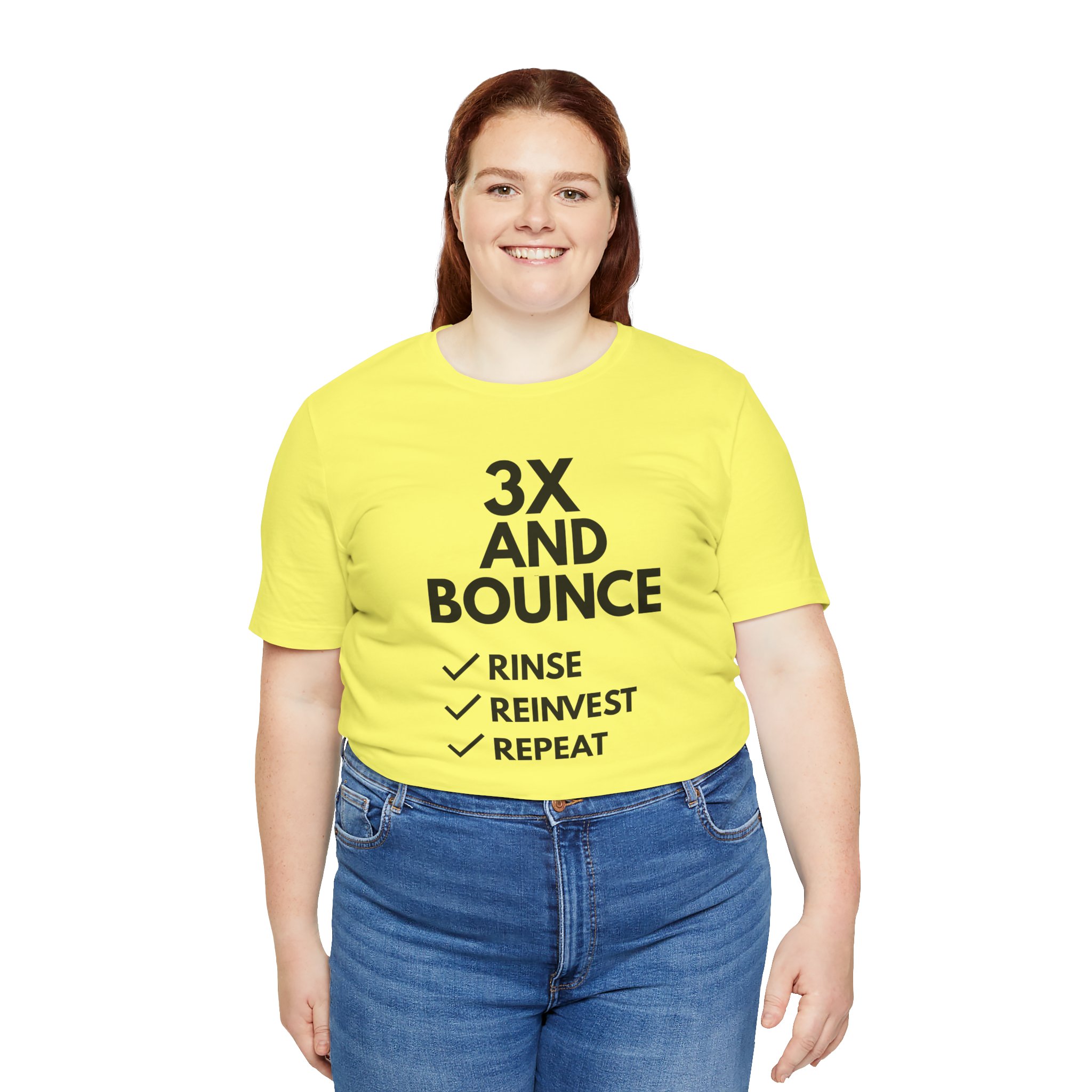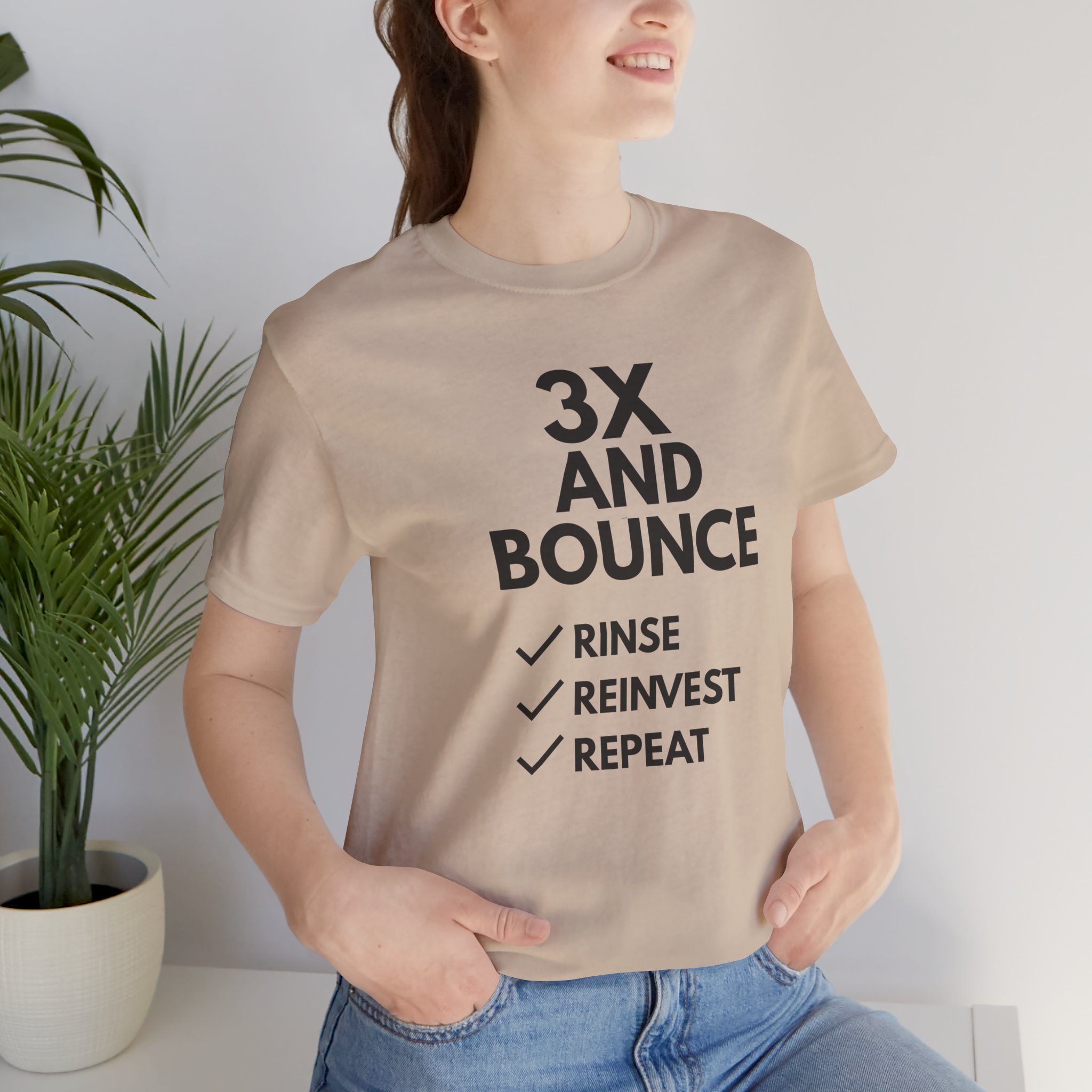 A clean, confident tee featuring “3X and Bounce” in sharp black print. Perfect for bright days and big moves — rinse, reinvest, repeat. Lightweight, motivating, and timeless.