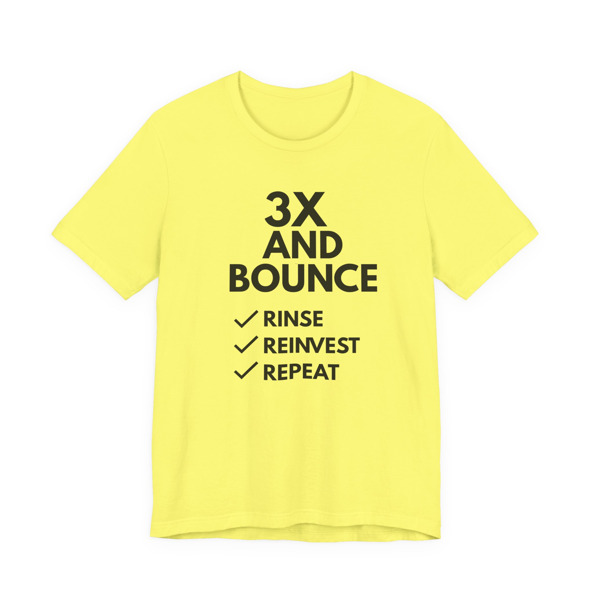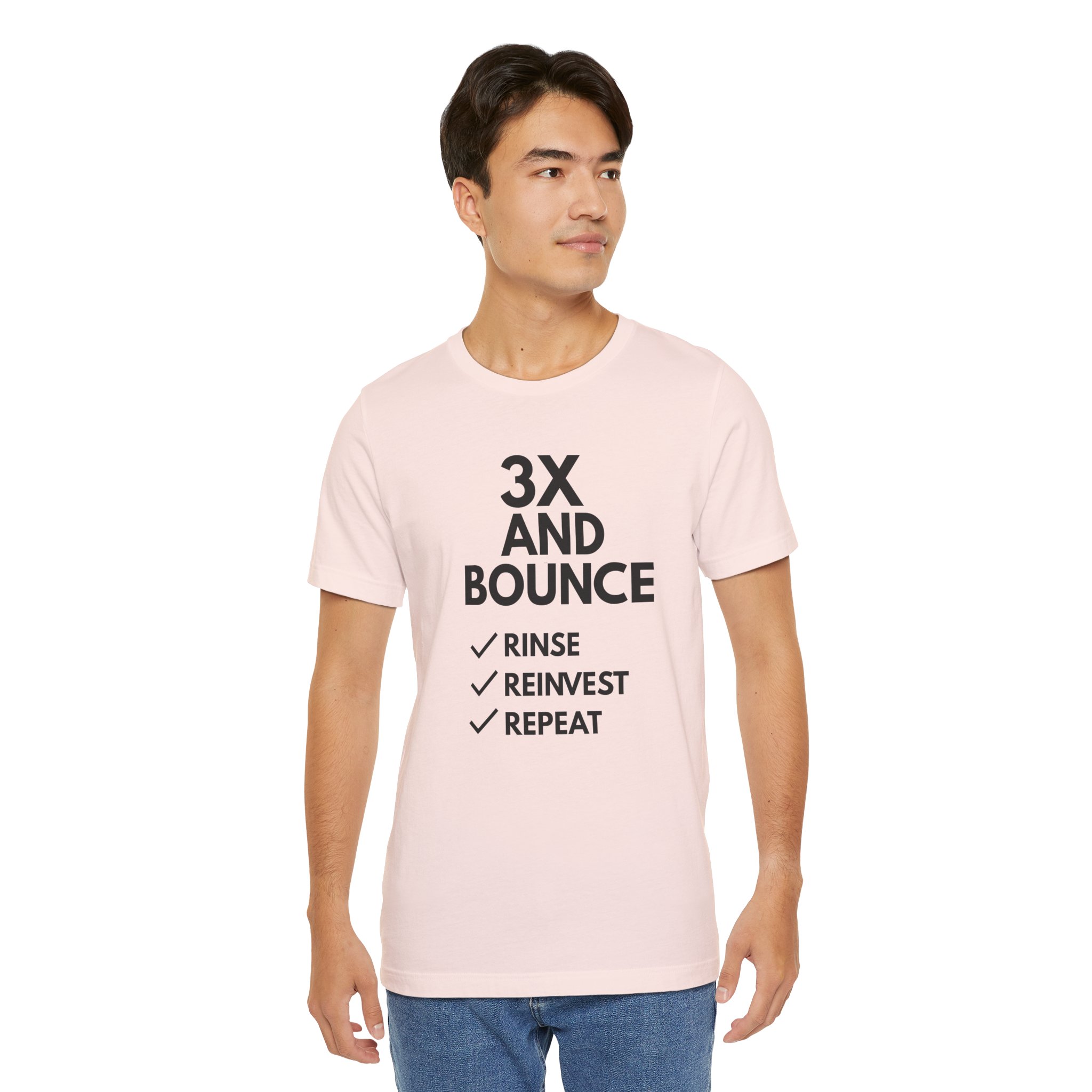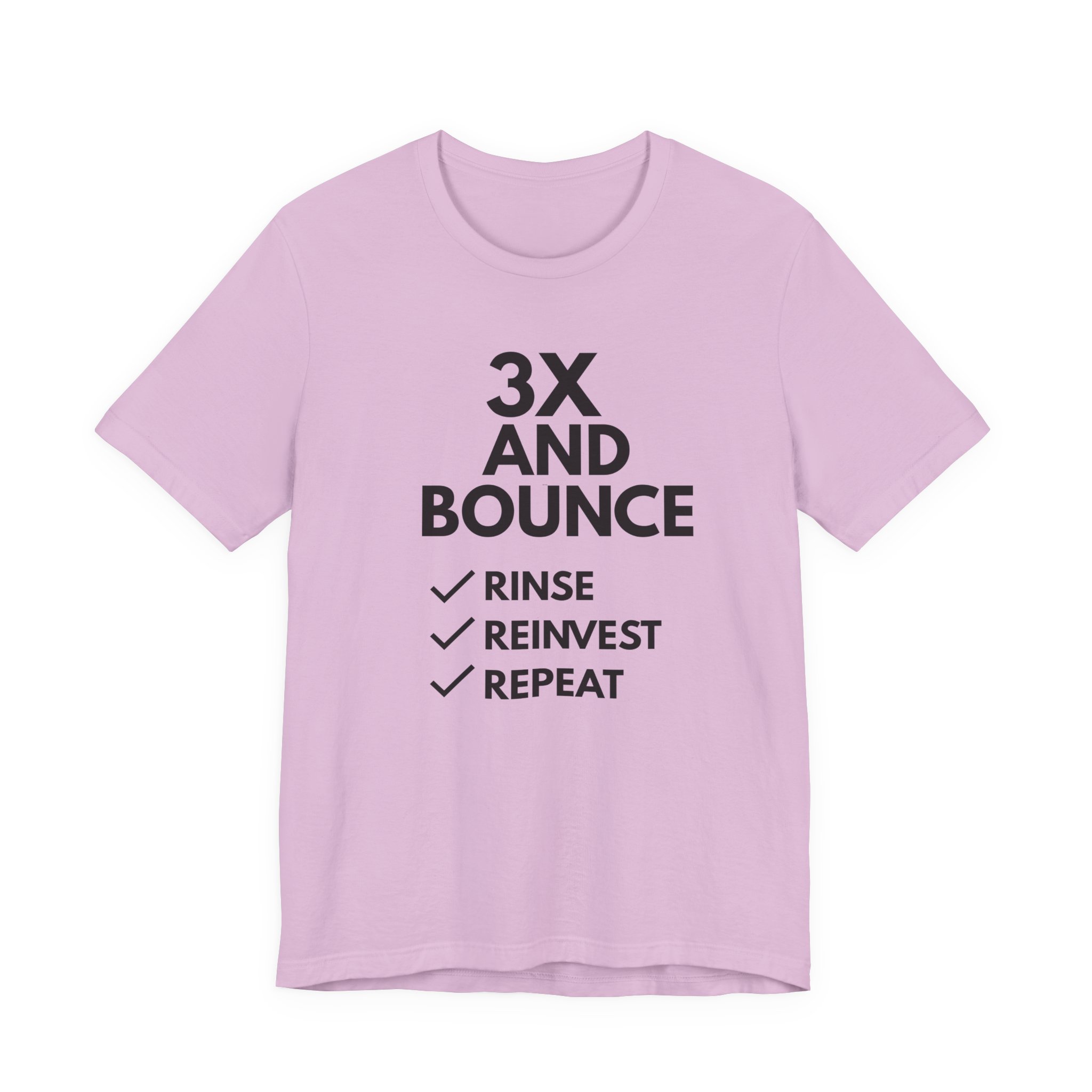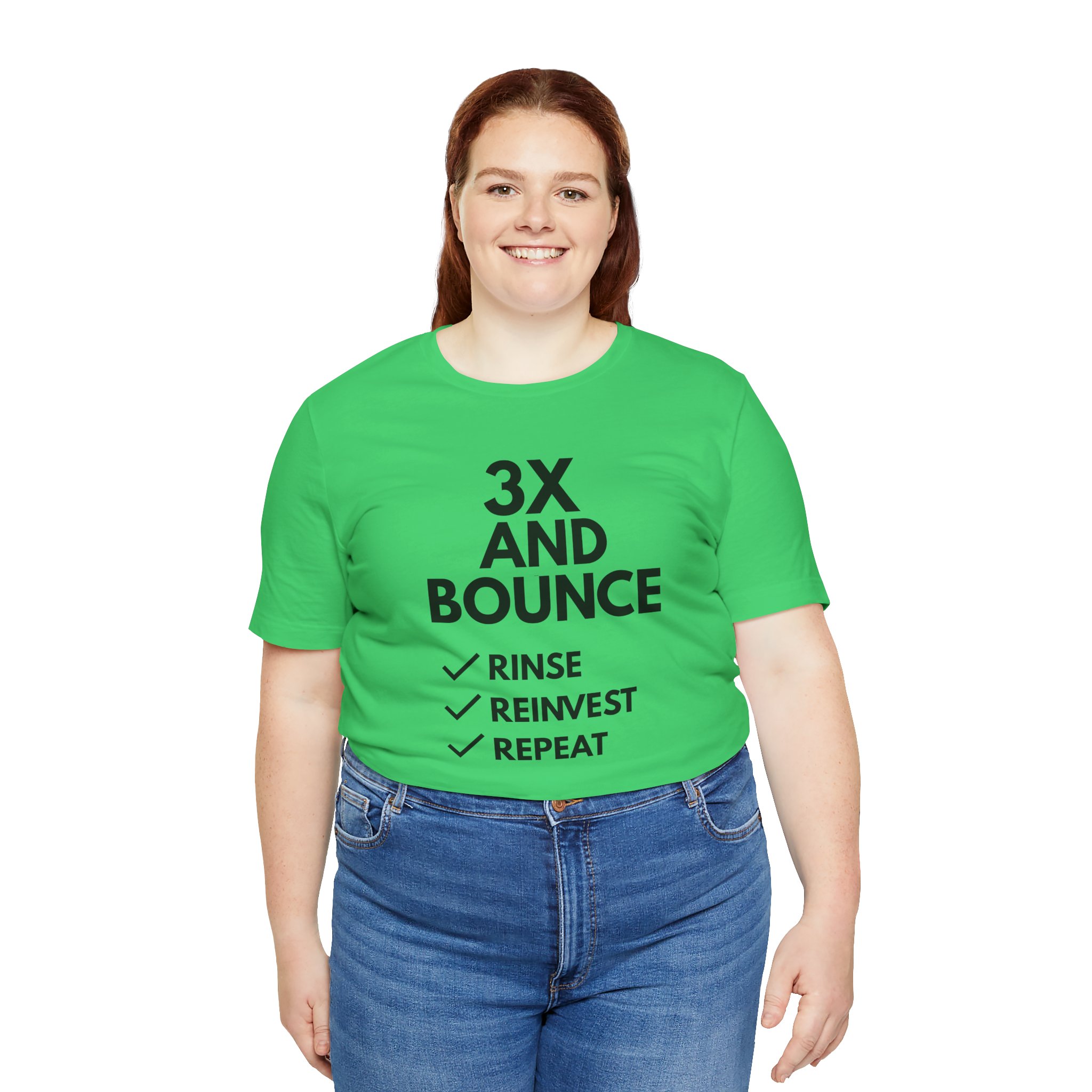 A clean, confident tee featuring “3X and Bounce” in sharp black print. Perfect for bright days and big moves — rinse, reinvest, repeat. Lightweight, motivating, and timeless.