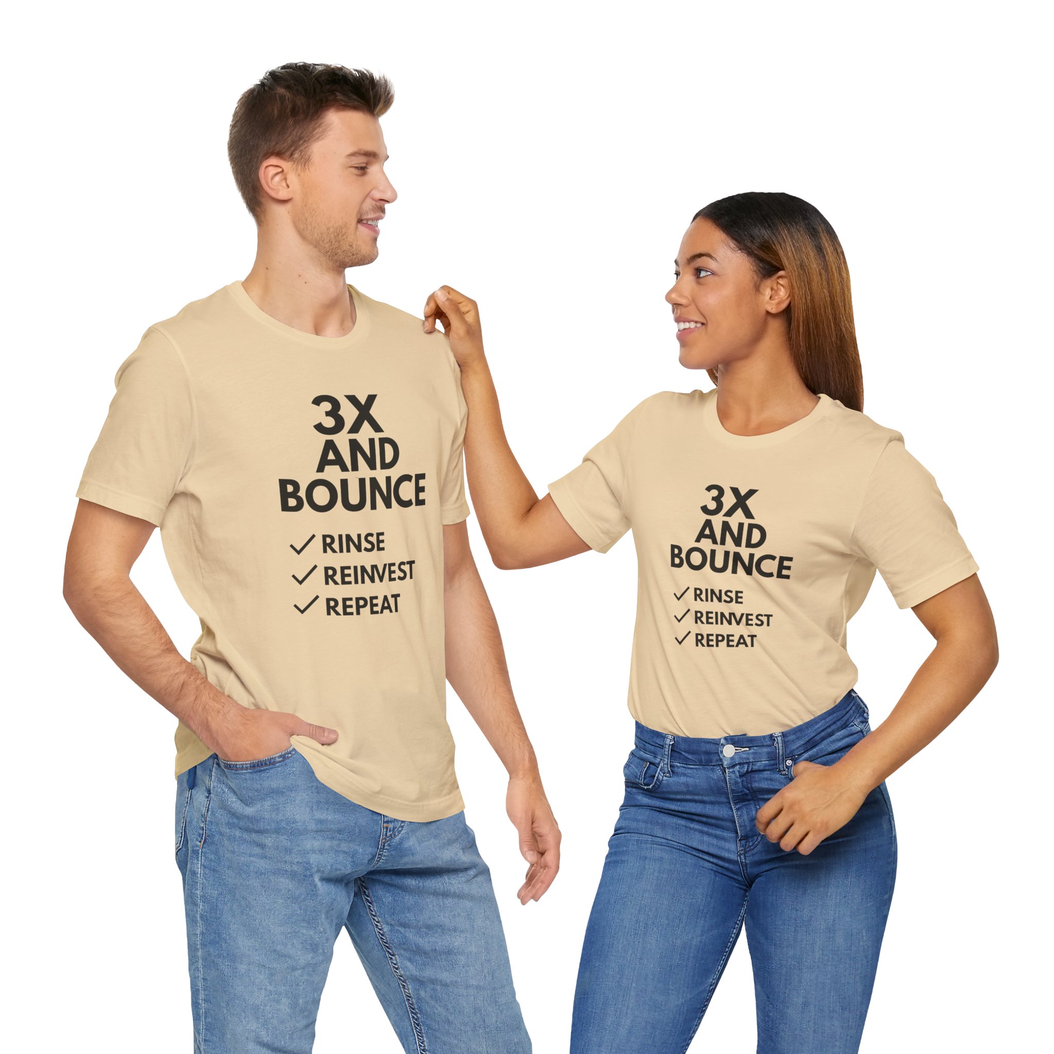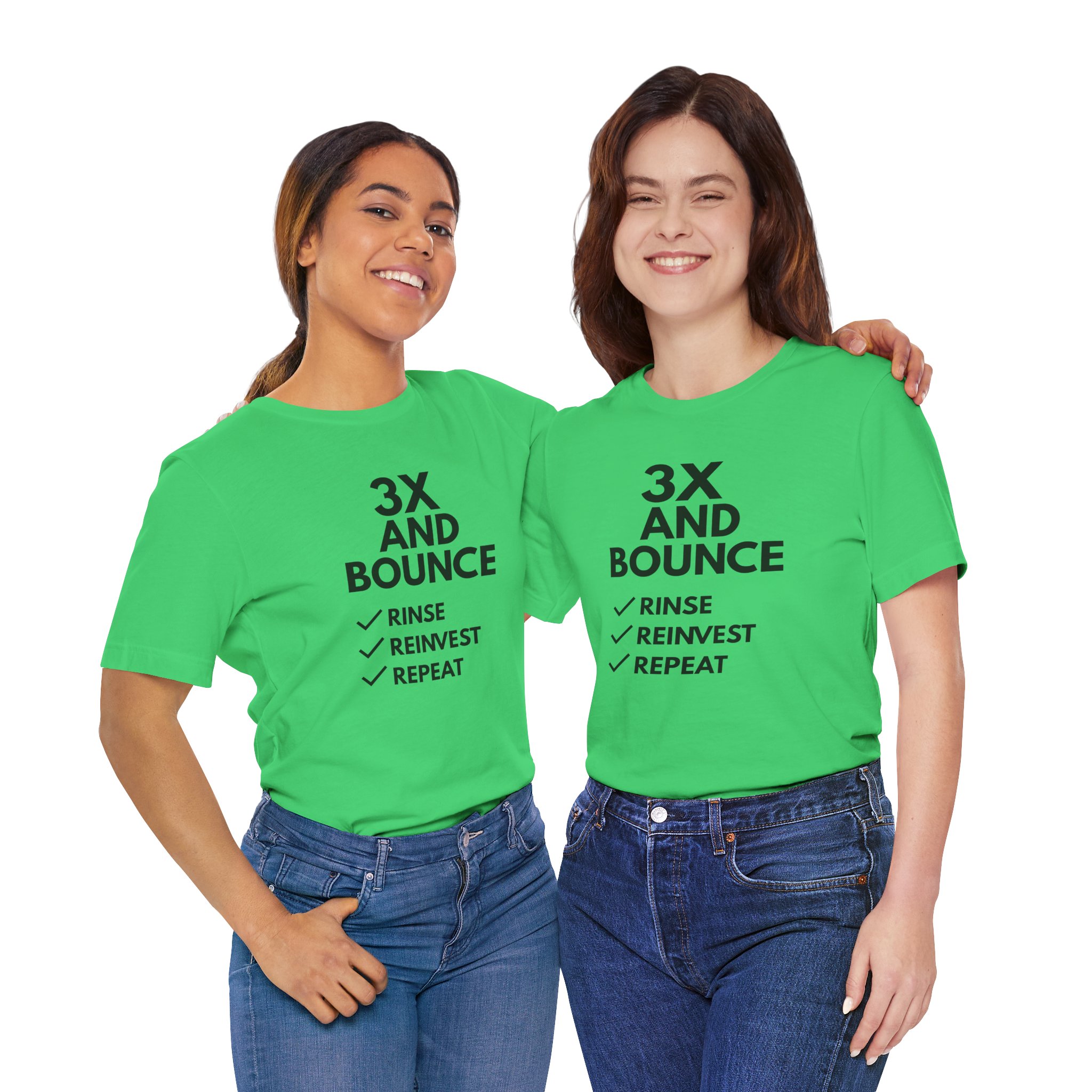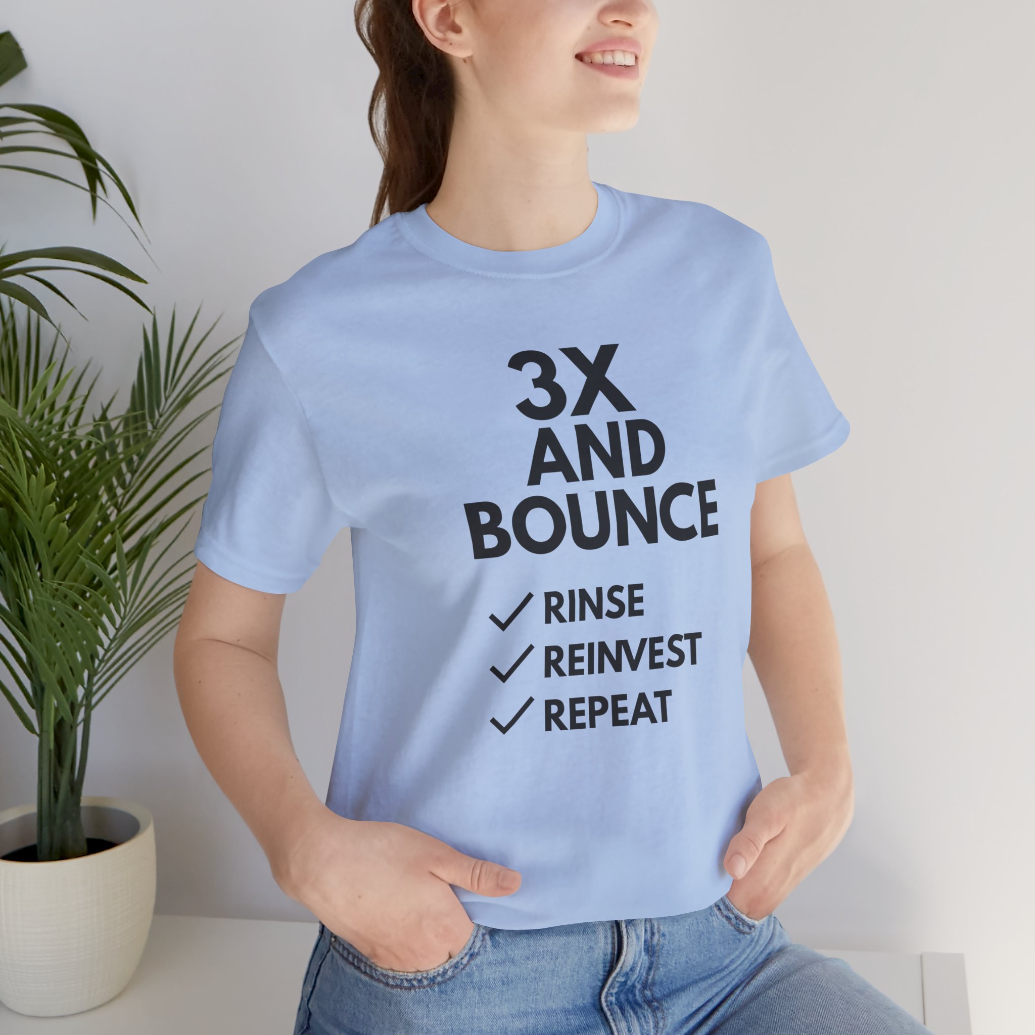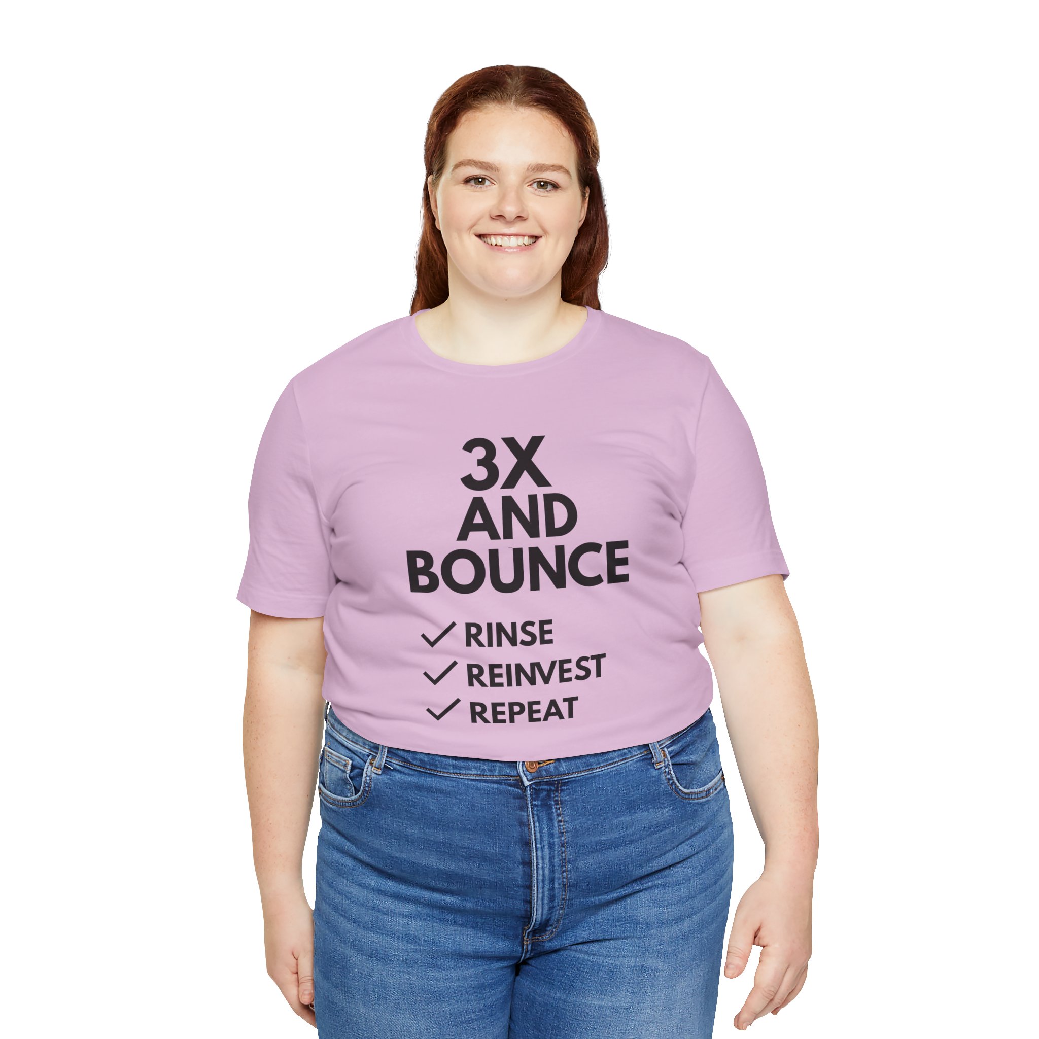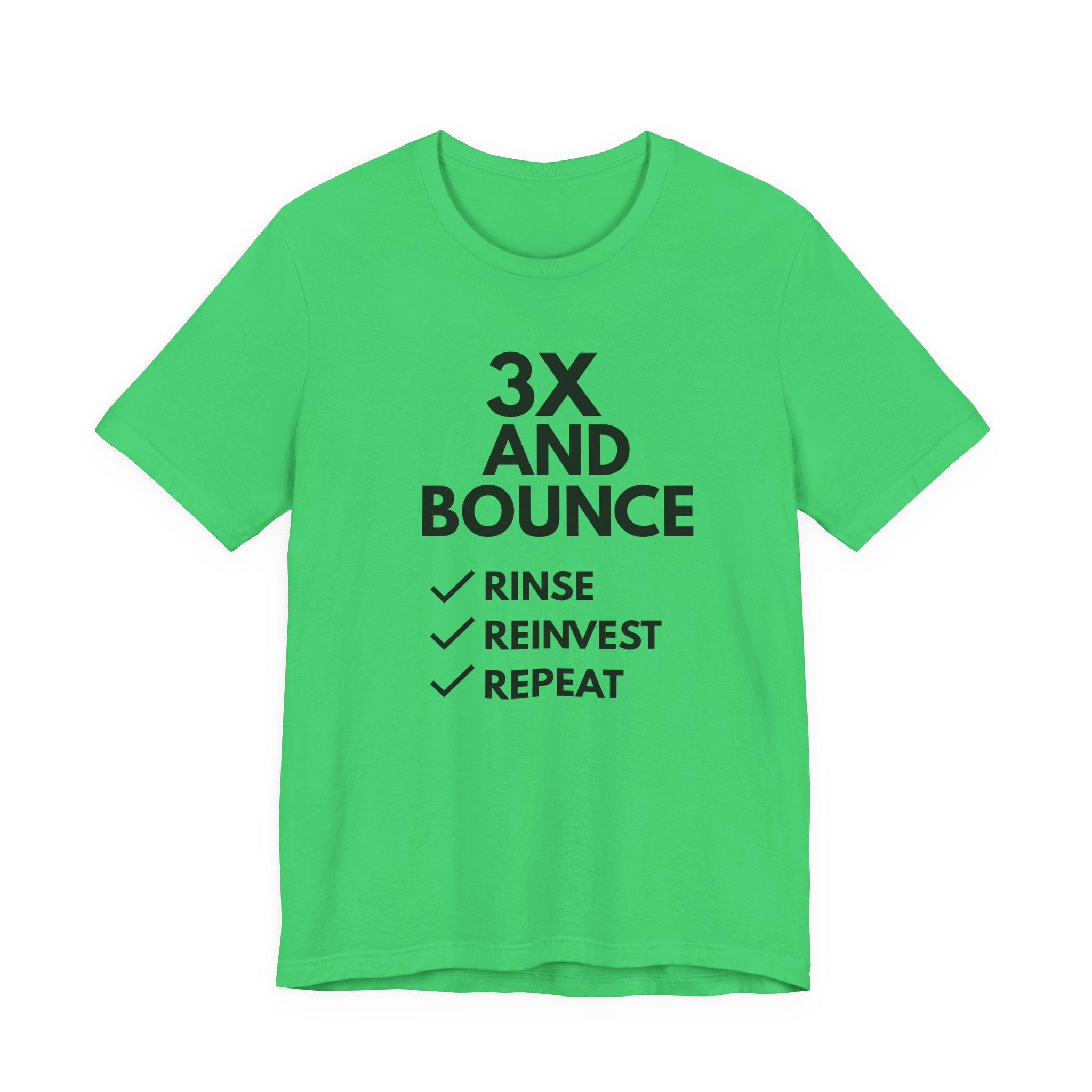 A clean, confident tee featuring “3X and Bounce” in sharp black print. Perfect for bright days and big moves — rinse, reinvest, repeat. Lightweight, motivating, and timeless.