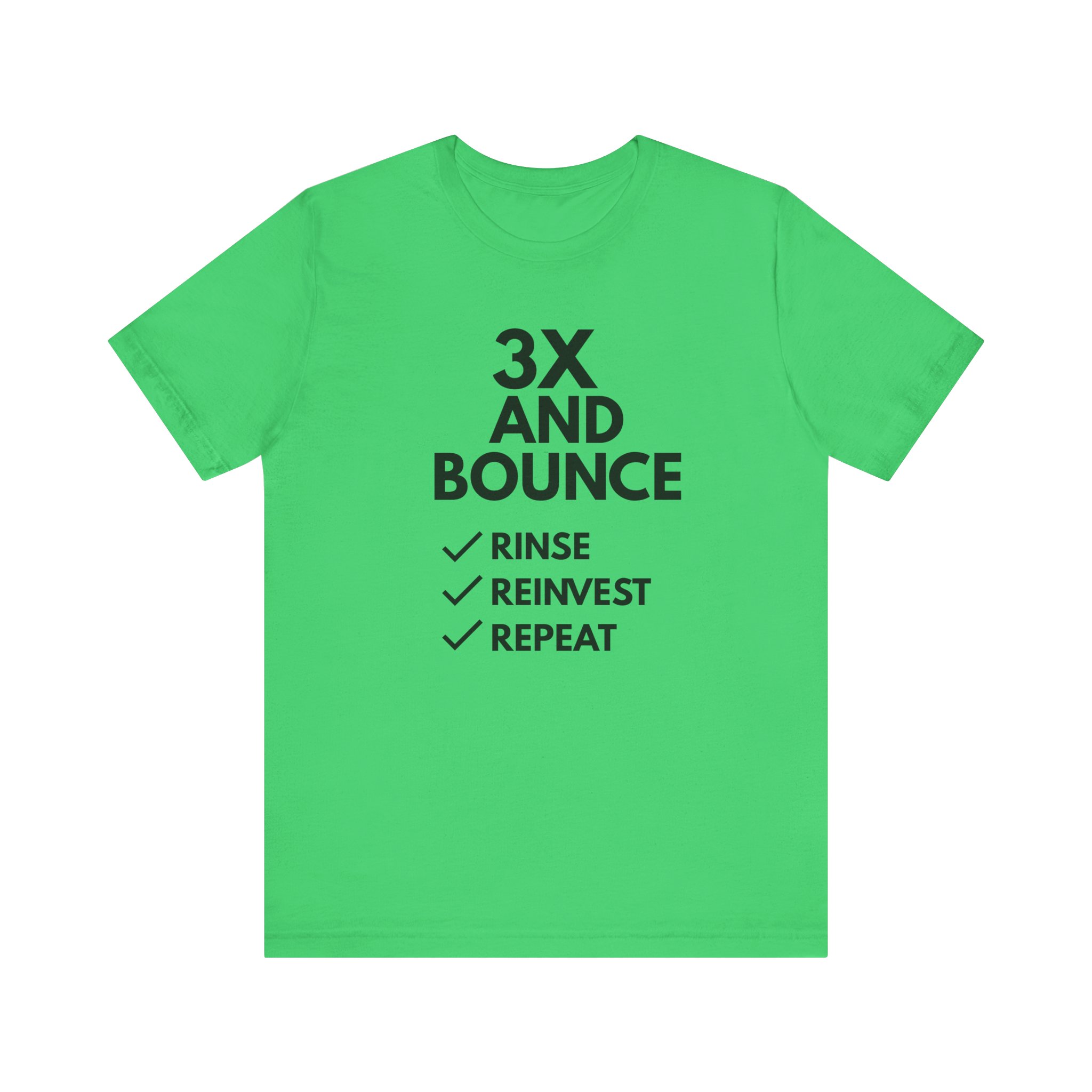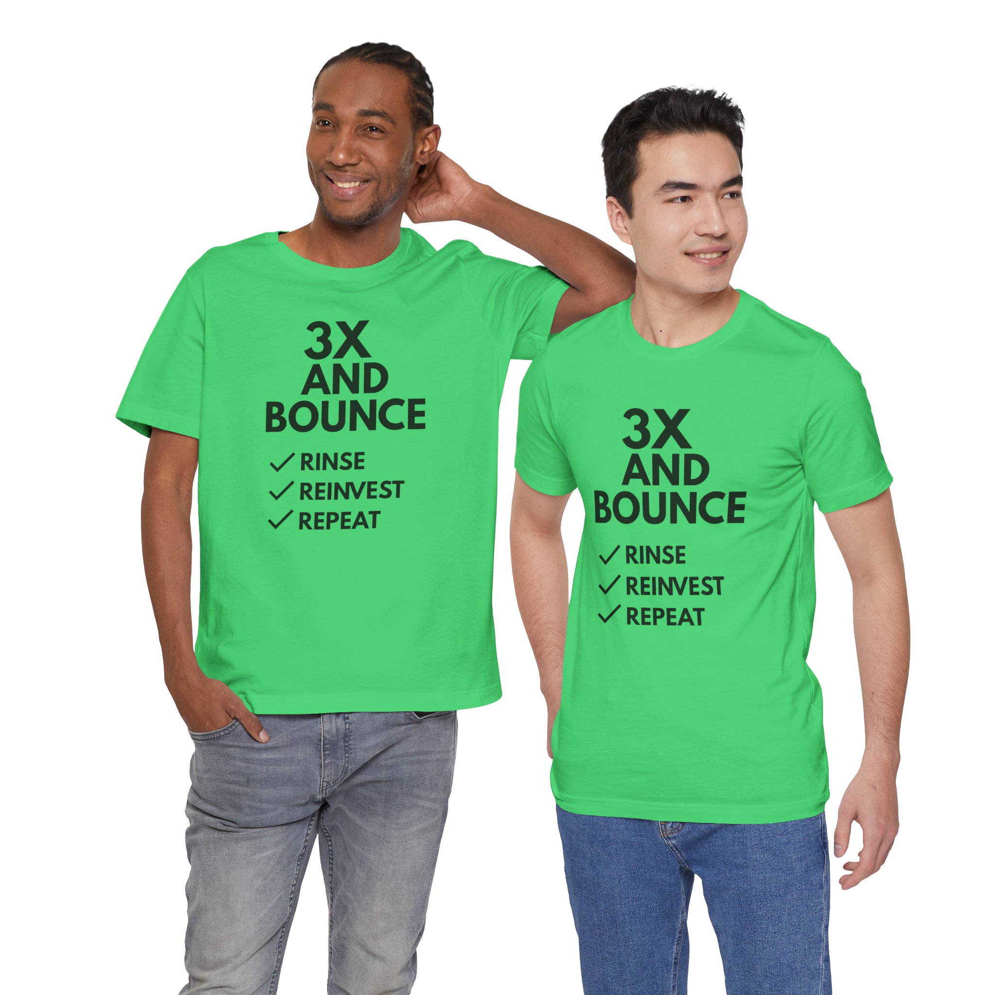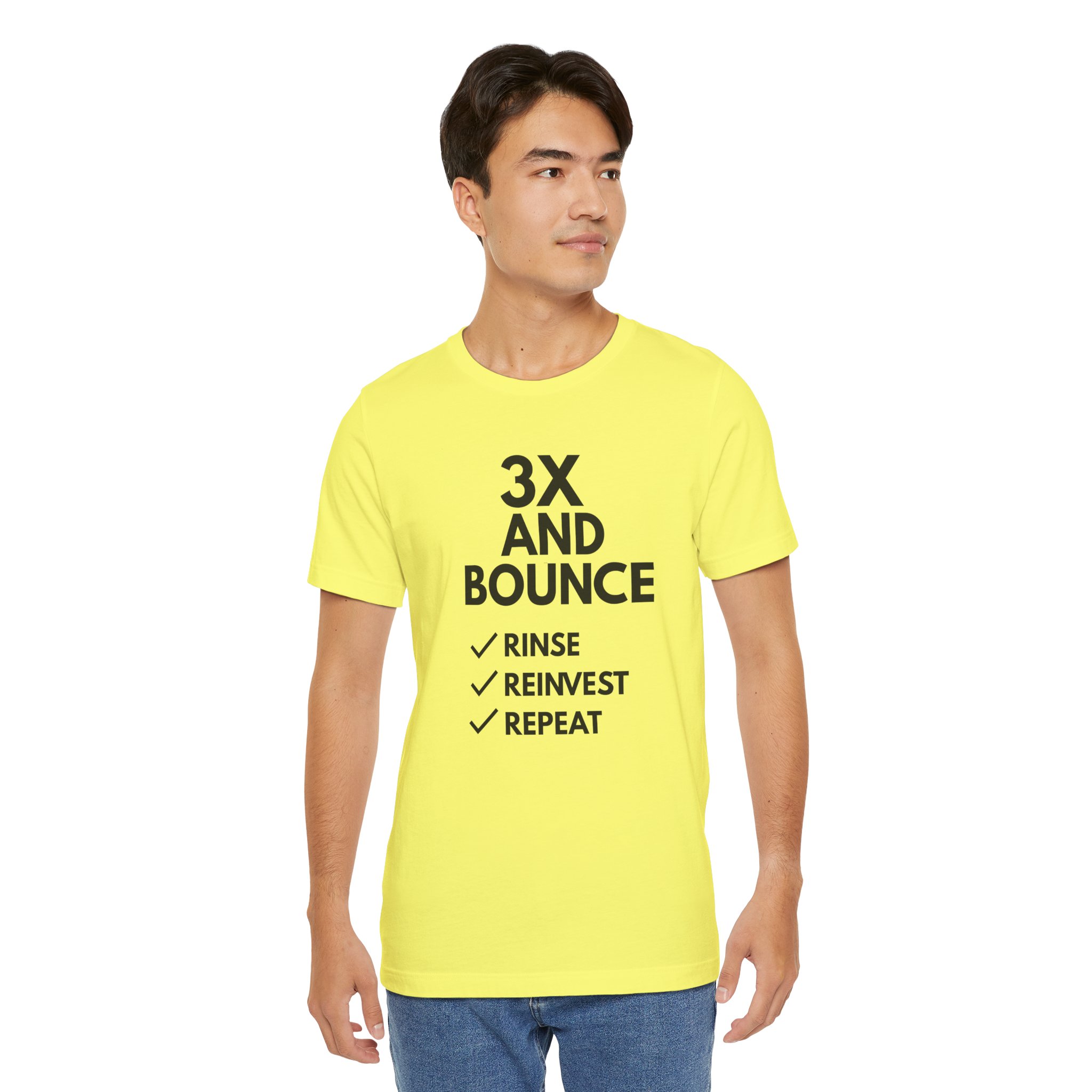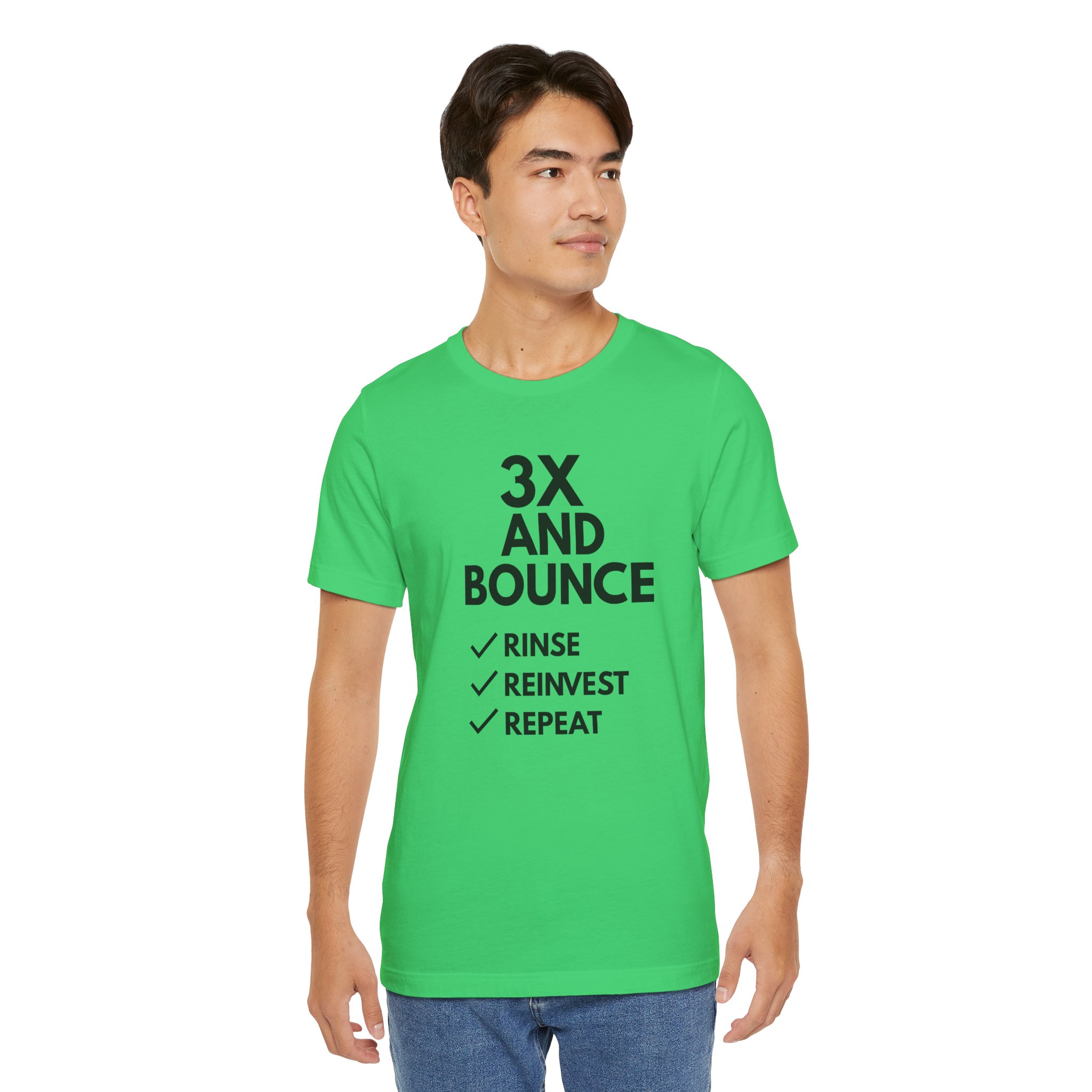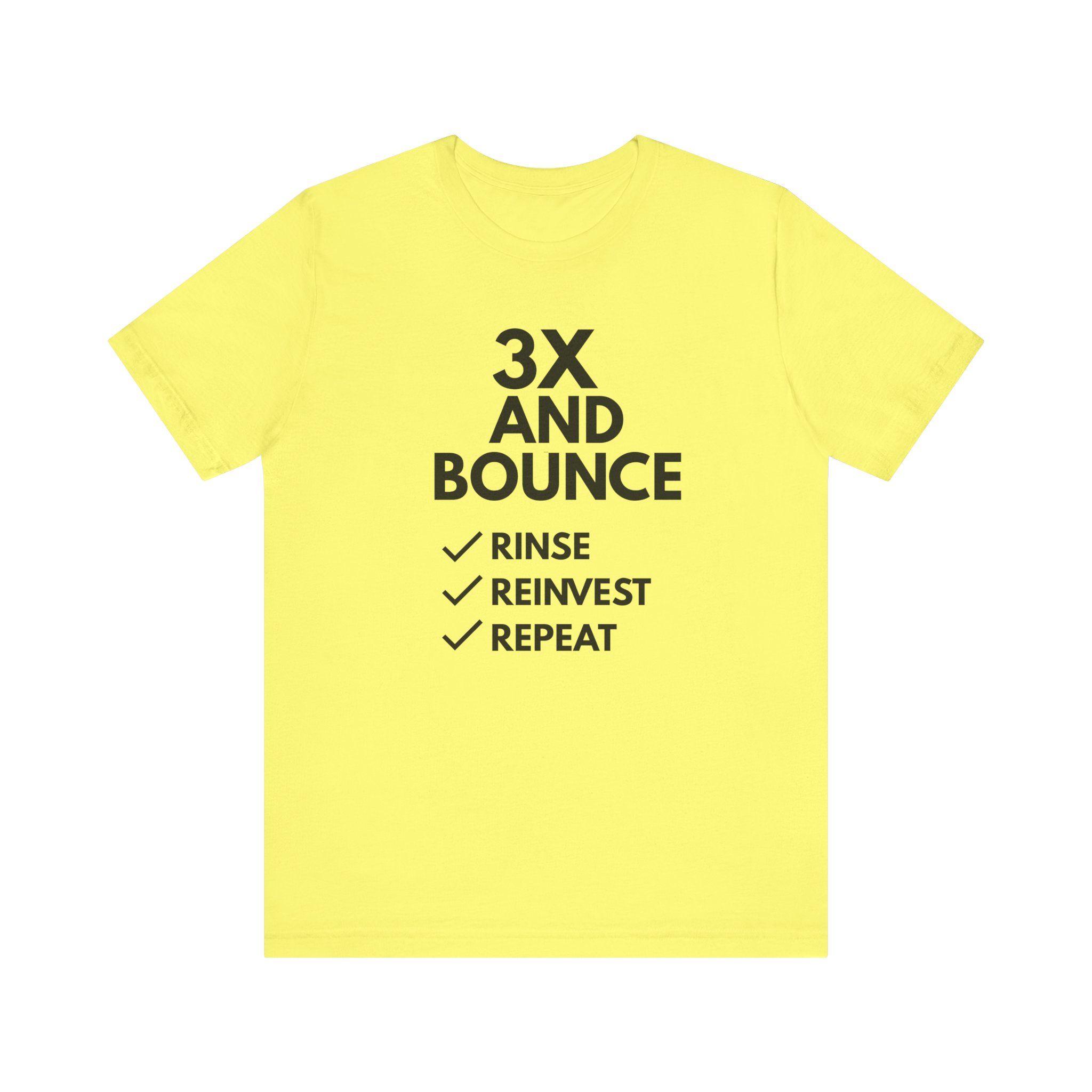A clean, confident tee featuring “3X and Bounce” in sharp black print. Perfect for bright days and big moves — rinse, reinvest, repeat. Lightweight, motivating, and timeless.